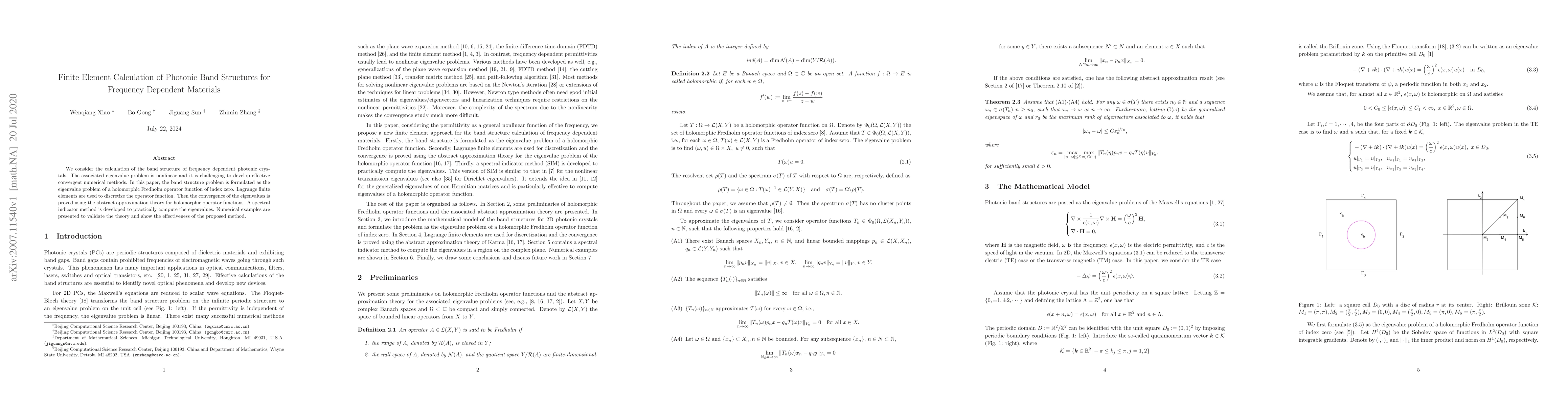 The paper presents a novel finite element method combined with a spectral indicator method for computing photonic band structures of frequency-dependent materials, backed by theoretical convergence proofs.