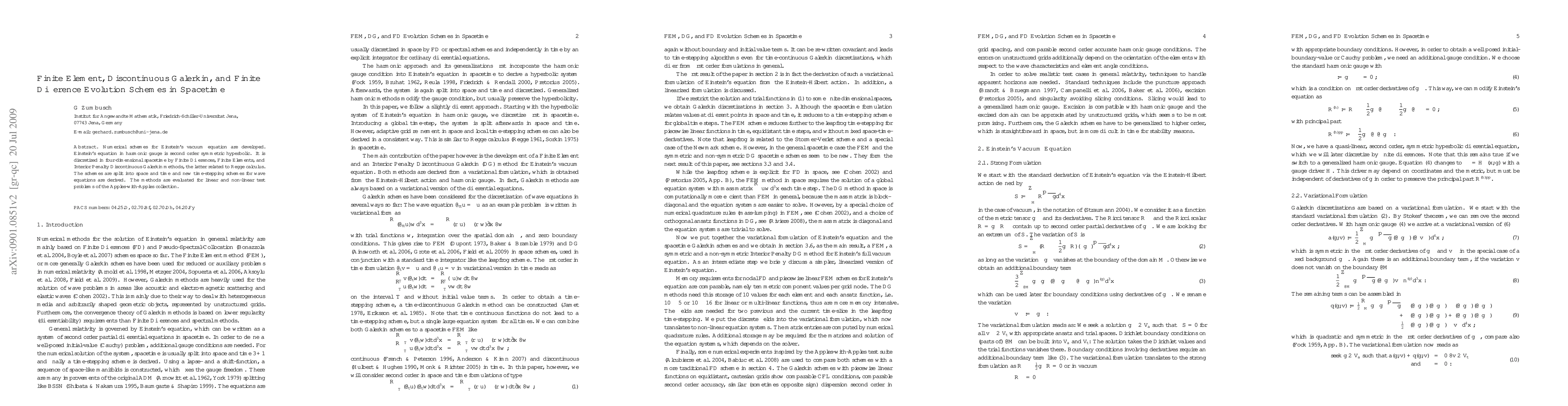 Numerical schemes for Einstein's vacuum equation are developed. Einstein's equation in harmonic gauge is second order symmetric hyperbolic. It is discretized in four-dimensional spacetime by Finite Differences, Finite Elements, and Interior Penalty Discontinuous Galerkin methods, the latter related to Regge calculus. The schemes are split into space and time and new time-stepping schemes for wave equations are derived. The methods are evaluated for linear and non-linear test problems of the Apples-with-Apples collection.