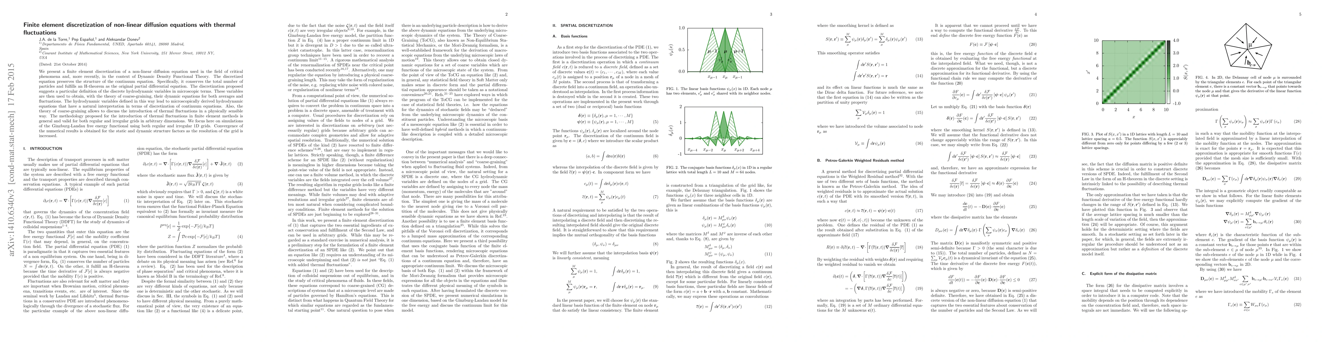 We present a finite element discretization of a non-linear diffusion equation used in the field of critical phenomena and, more recently, in the context of Dynamic Density Functional Theory. The discretized equation preserves the structure of the continuum equation. Specifically, it conserves the total number of particles and fulfills an H-theorem as the original partial differential equation. Guided by the Theory of Coarse-Graining, we discuss the inclusion of thermal fluctuations in the non-linear diffusion equation. This sheds light on the meaning of such a fluctuating hydrodynamics equation and to the limitations of the approximations involved. The methodology proposed for the introduction of thermal fluctuations in finite element methods is general and valid for both regular and irregular grids in arbitrary dimensions. We focus here on simulations of the Ginzburg-Landau free energy functional using both regular and irregular 1D grids. Convergence of the numerical results is obtained for the static and dynamic structure factors as the resolution of the grid is increased.