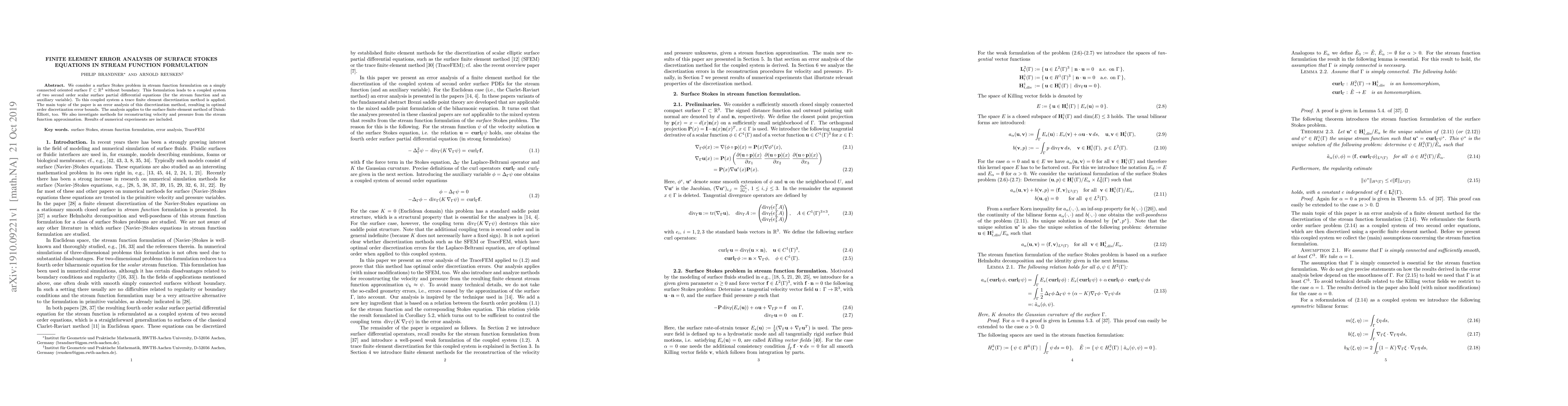 This paper analyzes the finite element discretization of surface Stokes equations in stream function formulation, deriving optimal error bounds for the method. It also explores methods for reconstructing velocity and pressure, and includes numerical experiments to validate the theoretical results.