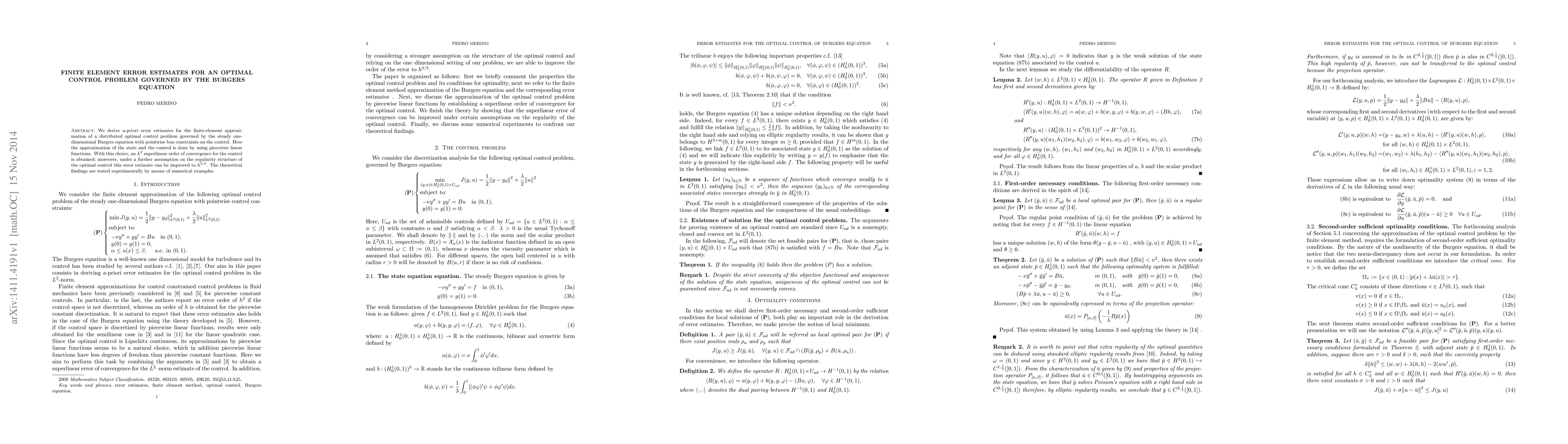 This paper derives a-priori error estimates for finite-element approximations of an optimal control problem governed by the Burgers equation, achieving an $L^2$ superlinear convergence rate for the control, and potentially improving to $h^{3/2}$ under additional regularity assumptions. Numerical examples validate the theoretical findings.