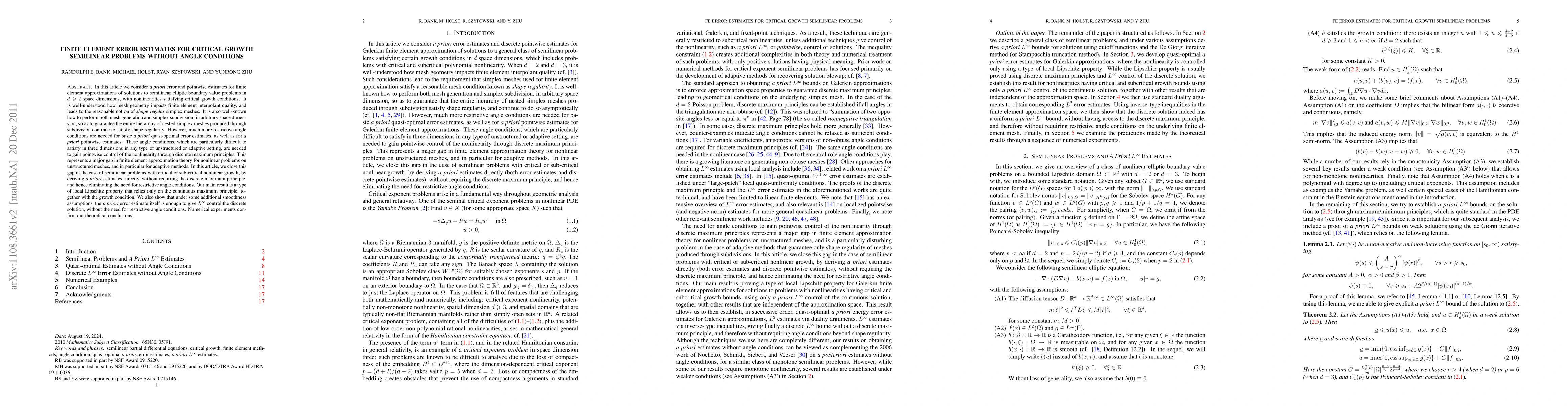 This paper develops a priori error and pointwise estimates for finite element approximations of semilinear elliptic boundary value problems with critical growth conditions, eliminating the need for restrictive angle conditions typically required for such estimates. The authors achieve this by deriving a local Lipschitz property based on the continuous maximum principle, thus providing a significant advancement in finite element approximation theory for nonlinear problems on unstructured meshes.