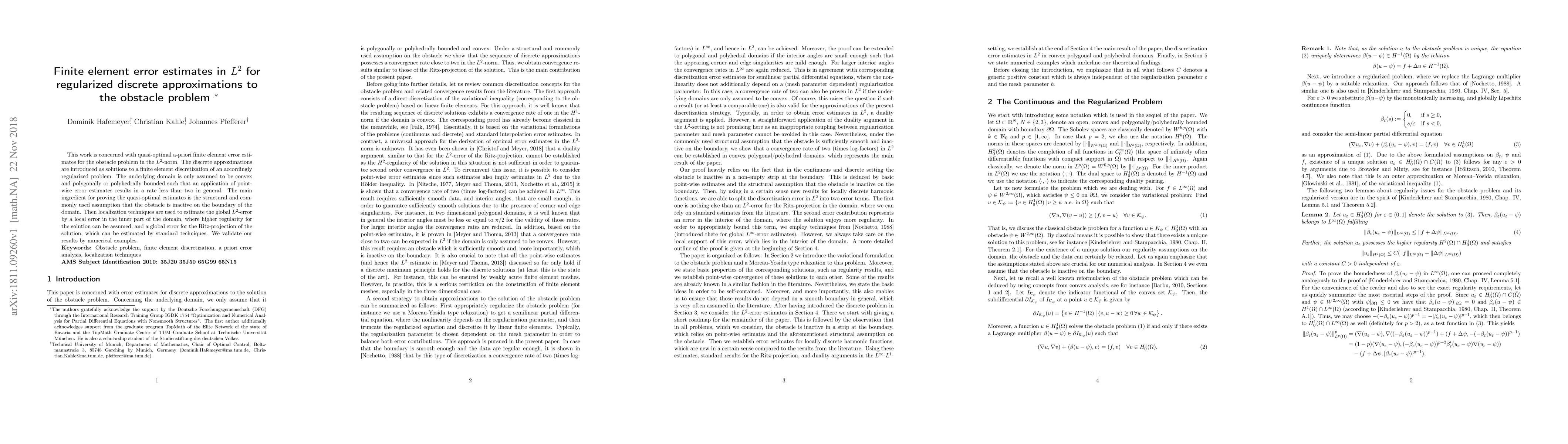 This paper provides quasi-optimal a-priori finite element error estimates for the obstacle problem in the $L^2$-norm, using regularized discrete approximations. The authors employ localization techniques to combine local inner domain errors and global Ritz-projection errors, validated by numerical examples.