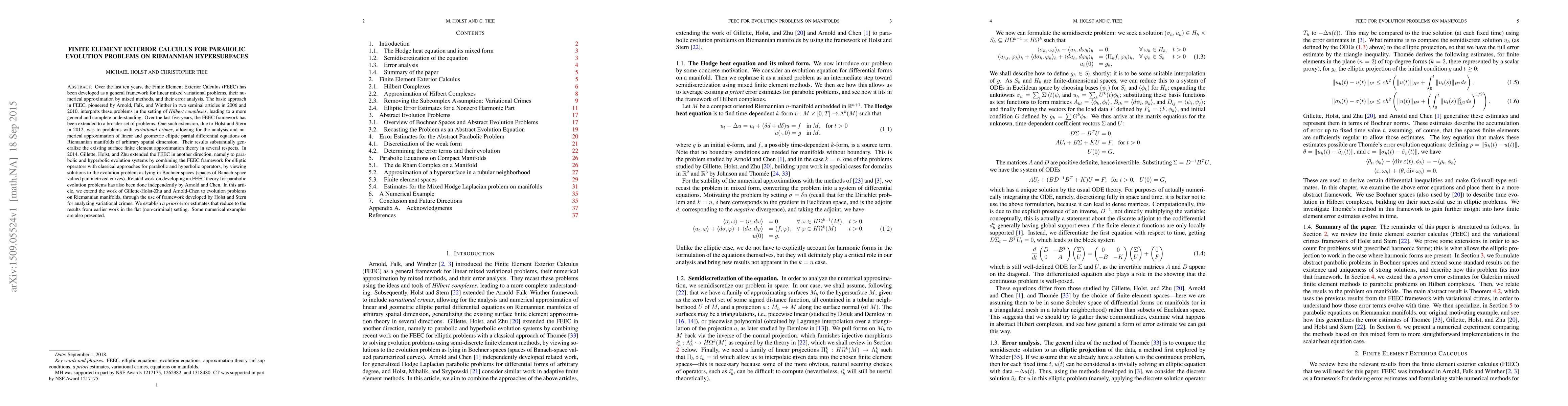 This paper extends the Finite Element Exterior Calculus (FEEC) framework to parabolic evolution problems on Riemannian hypersurfaces, building on prior work by Gillette-Holst-Zhu and Arnold-Chen. It establishes a priori error estimates and presents numerical examples to demonstrate the effectiveness of the new approach.