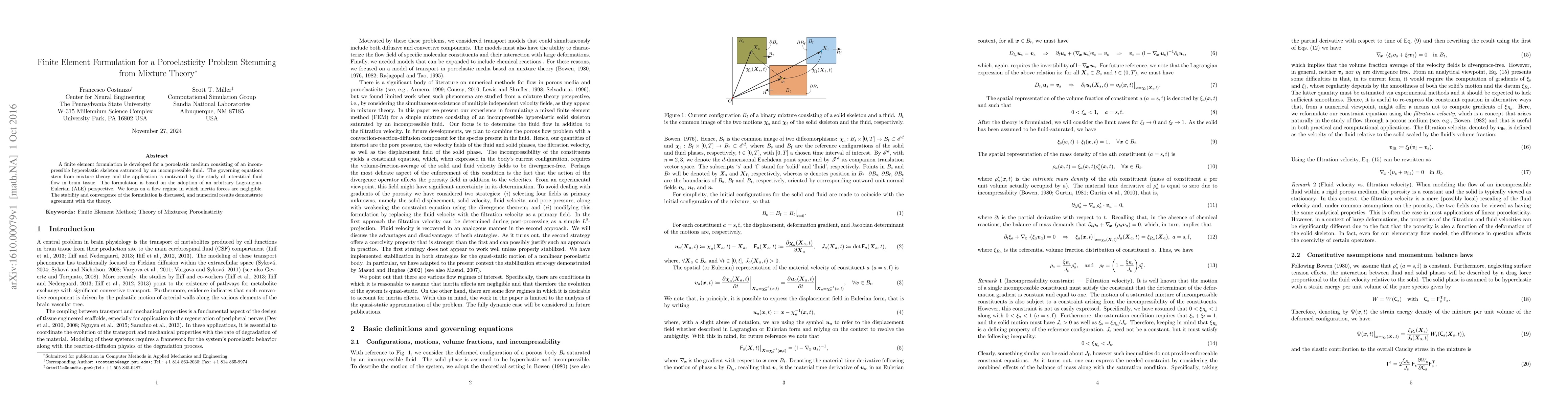 This paper develops a finite element formulation for poroelastic media based on mixture theory, focusing on interstitial fluid flow in brain tissue. The approach uses an ALE perspective and neglects inertia forces, with stability and convergence discussed, and numerical results confirming theoretical predictions.