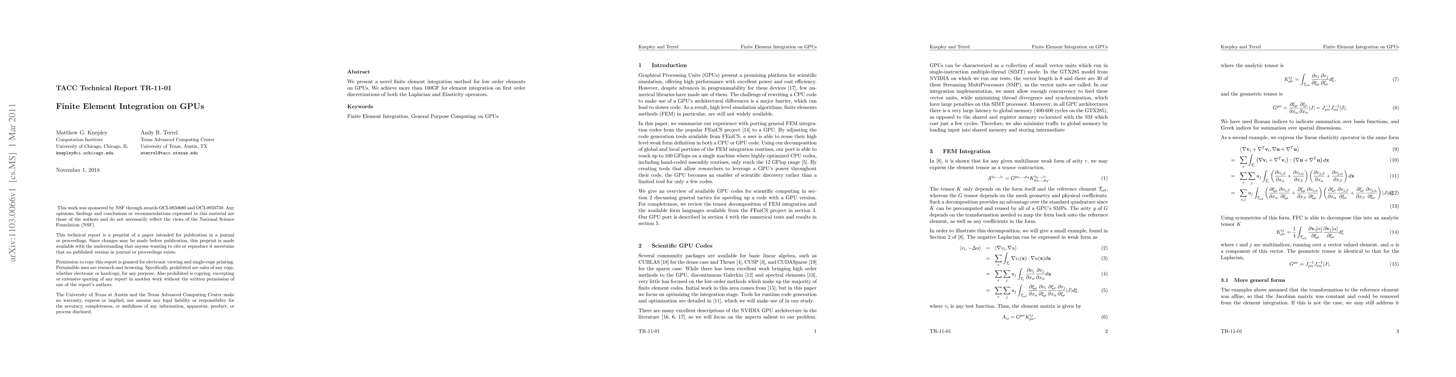 The paper presents a novel finite element integration method for low order elements on GPUs, achieving over 100GFLOPS for element integration on first-order discretizations of Laplacian and Elasticity operators using an isoparametric approach and projecting the Jacobian into a finite element space.
