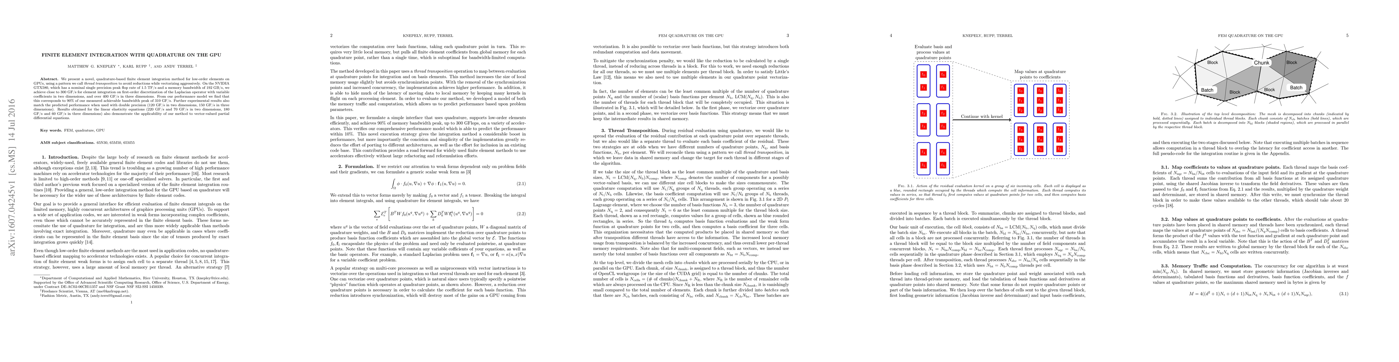 This paper introduces a novel quadrature-based finite element integration method on GPUs using a technique called thread transposition to achieve high performance. The method achieves near-optimal bandwidth utilization, demonstrating significant speedups for various partial differential equations.