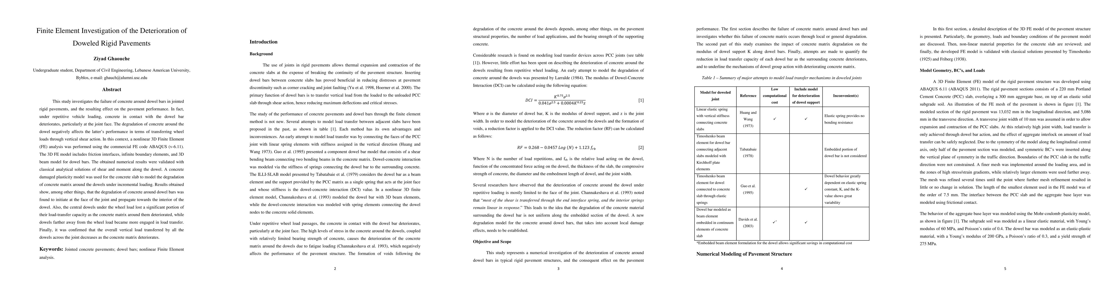 The purpose of this study is to describe the failure of concrete around dowel bars in jointed rigid pavements, and the resulting effect on the pavement performance. In fact, under repetitive vehicle loading, concrete in contact with the dowel bar deteriorates, particularly at the joint face. The degradation of concrete around the dowel negatively affects the latter's performance in terms of transferring wheel loads through vertical shear action. In this context, a nonlinear 3D Finite Element analysis was performed using the commercial FE code Abaqus (v-6.11). The FE model was validated with classical analytical solutions of shear and moment along the dowel. A concrete damaged plasticity model was used for the PCC slab to model the degradation of concrete matrix around the dowels under incremental loading. Results obtained show, among other things, that the degradation of concrete matrix around the dowel was found to initiate at the face of the joint and propagate towards the interior of the dowel. Also, results obtained confirmed the decrease in load transfer capability of the dowels as the PCC matrix deteriorates. The central dowels under the wheel load lost a significant portion of their load-transfer capacity as the PCC matrix around them deteriorated, while dowels farther away from the wheel load became more engaged in load transfer.