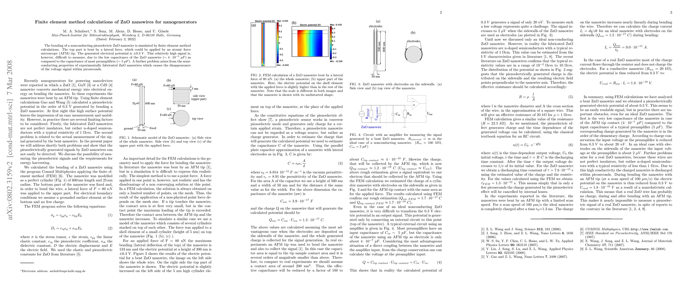 This paper uses finite element method to simulate the bending of ZnO nanowires, revealing a generated electrical potential of 0.3 V, though challenges in measurement arise due to low capacitance and semiconducting properties that quickly dissipate the voltage signal.