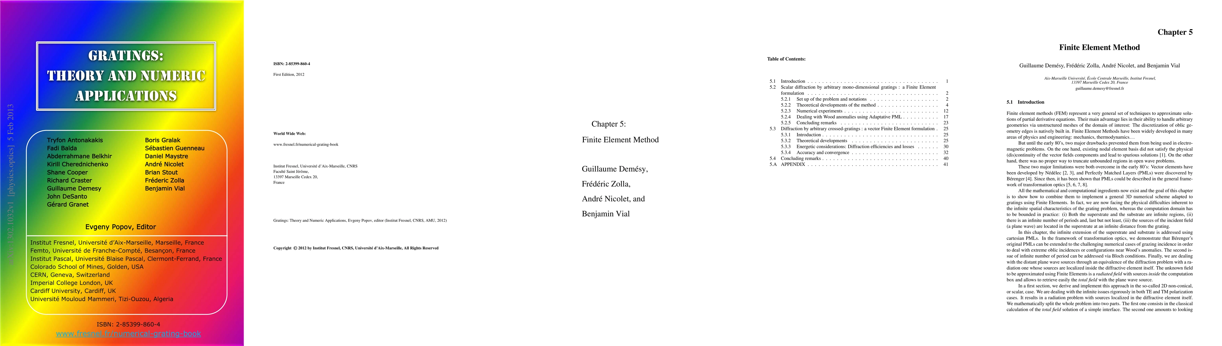 In this chapter, we demonstrate a general formulation of the Finite Element Method allowing to calculate the diffraction efficiencies from the electromagnetic field diffracted by arbitrarily shaped gratings embedded in a multilayered stack lightened by a plane wave of arbitrary incidence and polarization angle. It relies on a rigorous treatment of the plane wave sources problem through an equivalent radiation problem with localized sources. Bloch conditions and a new Adaptative Perfectly Matched Layer have been implemented in order to truncate the computational domain. We derive this formulation for both mono-dimensional gratings in TE/TM polarization cases (2D or scalar case) and for the most general bidimensional or crossed gratings (3D or vector case). The main advantage of this formulation is its complete generality with respect to the studied geometries and the material properties. Its principle remains independent of both the number of diffractive elements by period and number of stack layers. The flexibility of our approach makes it a handy and powerful tool for the study of metamaterials, finite size photonic crystals, periodic plasmonic structures.