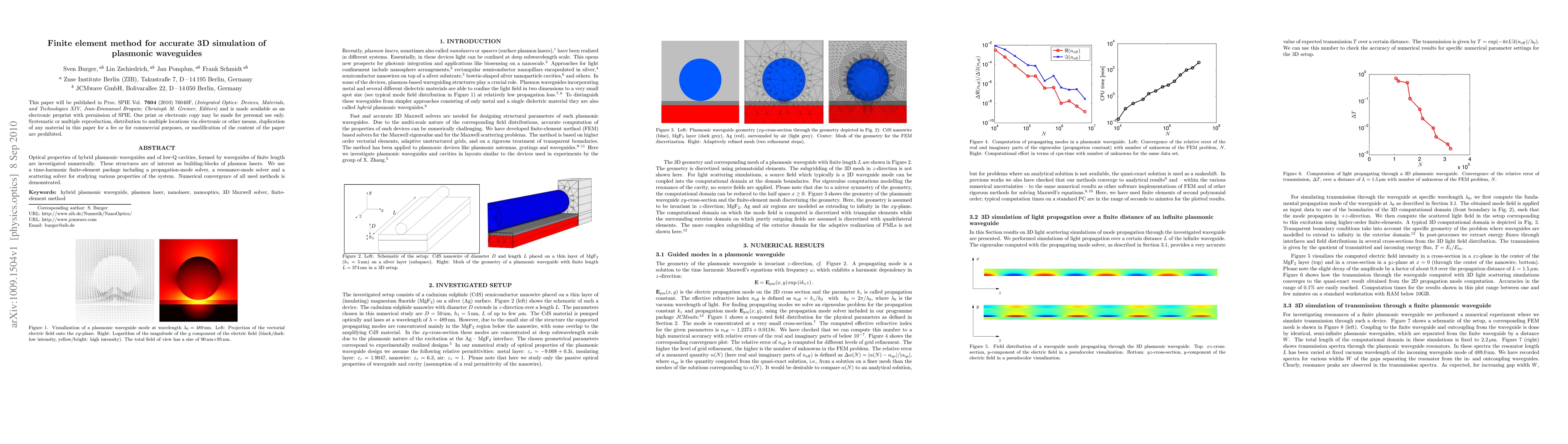 Optical properties of hybrid plasmonic waveguides and of low-Q cavities, formed by waveguides of finite length are investigated numerically. These structures are of interest as building-blocks of plasmon lasers. We use a time-harmonic finite-element package including a propagation-mode solver, a resonance-mode solver and a scattering solver for studying various properties of the system. Numerical convergence of all used methods is demonstrated.