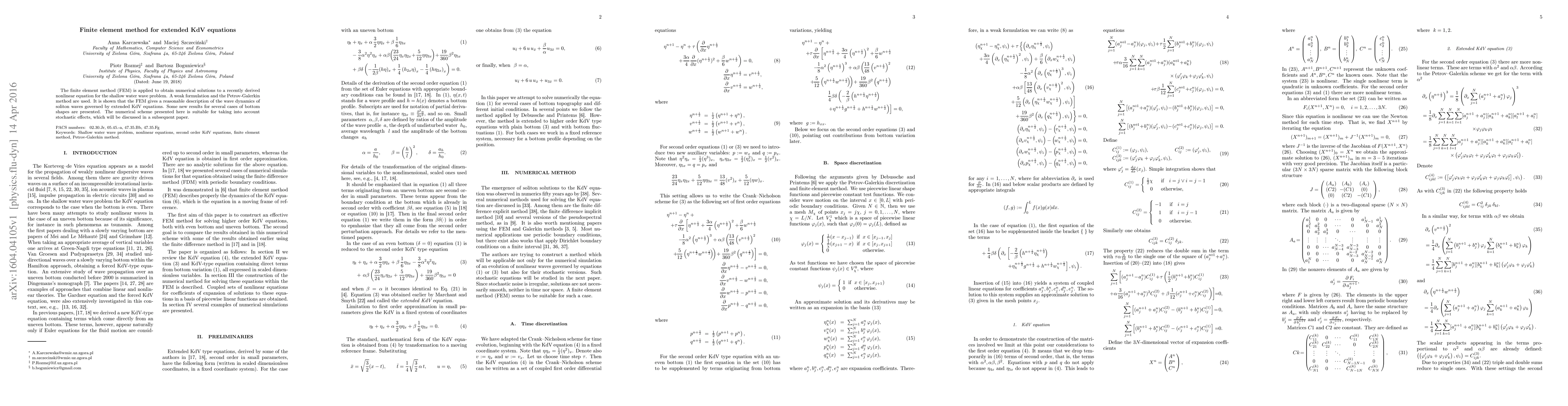 The paper applies the finite element method to solve extended KdV equations for shallow water waves, demonstrating its effectiveness through a weak formulation and Petrov-Galerkin method. The method provides accurate soliton wave dynamics and presents new results for various bottom shapes.