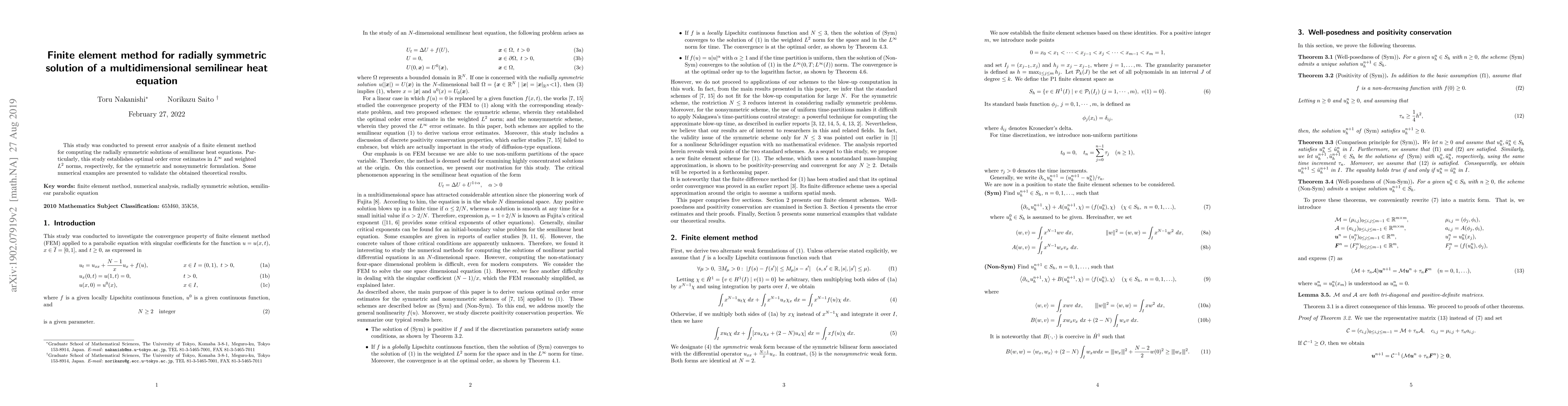 This study aims to present the error and numerical blow up analyses of a finite element method for computing the radially symmetric solutions of semilinear heat equations. In particular, this study establishes optimal order error estimates in $L^\infty$ and weighted $L^2$ norms for the symmetric and nonsymmetric formulation, respectively. Some numerical examples are presented to validate the obtained theoretical results.