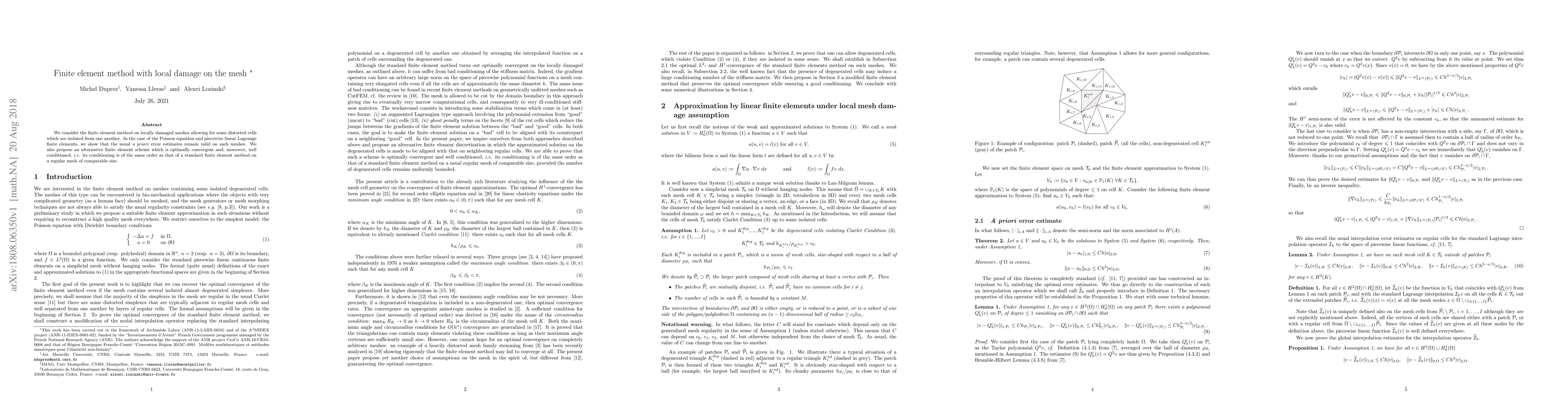 The research introduces a finite element method applicable to locally damaged meshes, maintaining valid error estimates for the Poisson equation with linear Lagrange elements. An optimally convergent, well-conditioned alternative scheme is also proposed, ensuring mesh conditioning comparable to regular meshes of similar size.