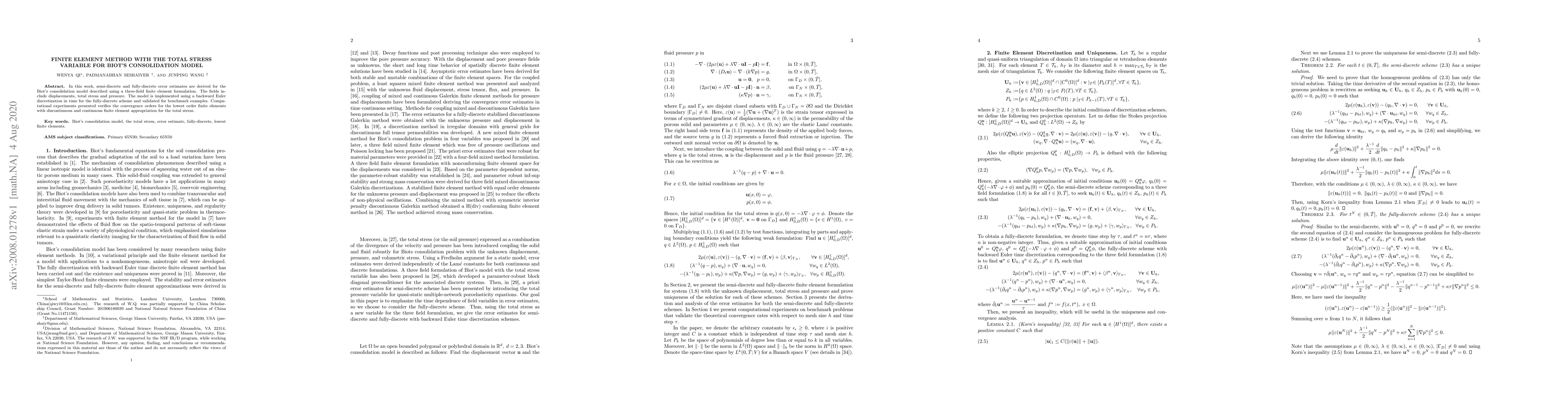 This paper derives error estimates for a finite element method applied to Biot's consolidation model using a three-field formulation. It validates the method with backward Euler time discretization and confirms convergence orders through computational experiments.