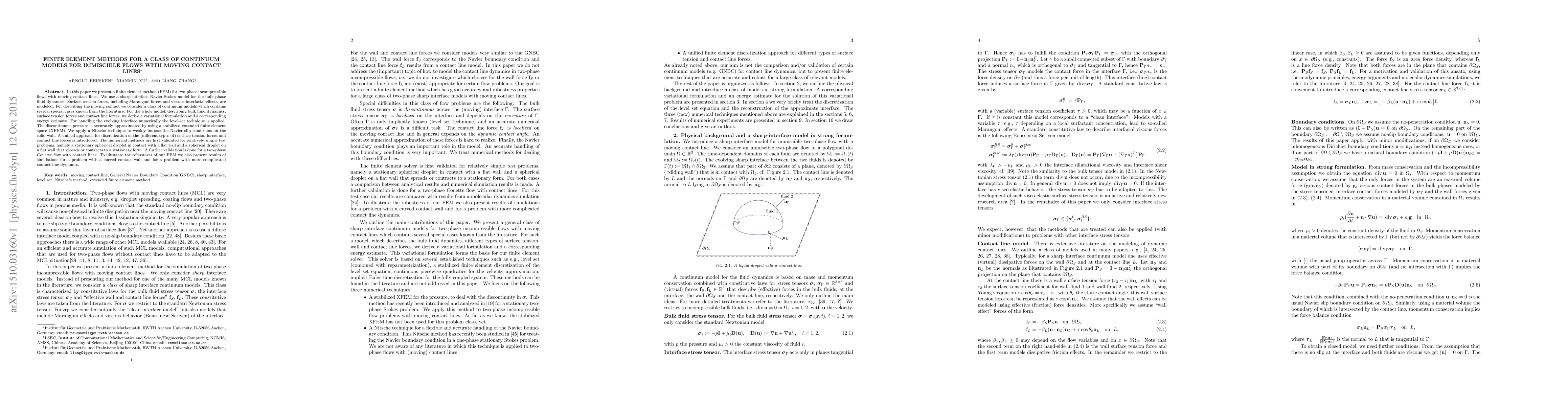 This paper proposes a finite element method for modeling immiscible two-phase incompressible flows with moving contact lines, utilizing a sharp interface Navier-Stokes model, surface tension forces, and a stabilized extended finite element space for accurate pressure approximation. Numerical validations include various test problems demonstrating the method's robustness.