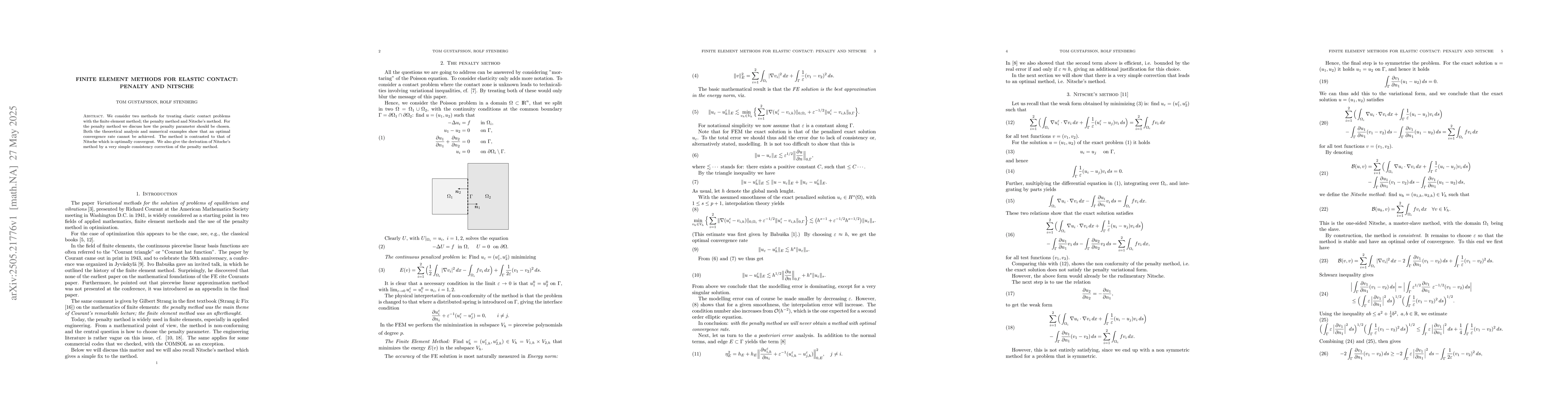 The research compares the penalty method and Nitsche's method for solving elastic contact problems using finite element methods, analyzing the penalty parameter choice and deriving Nitsche's method from the penalty method.