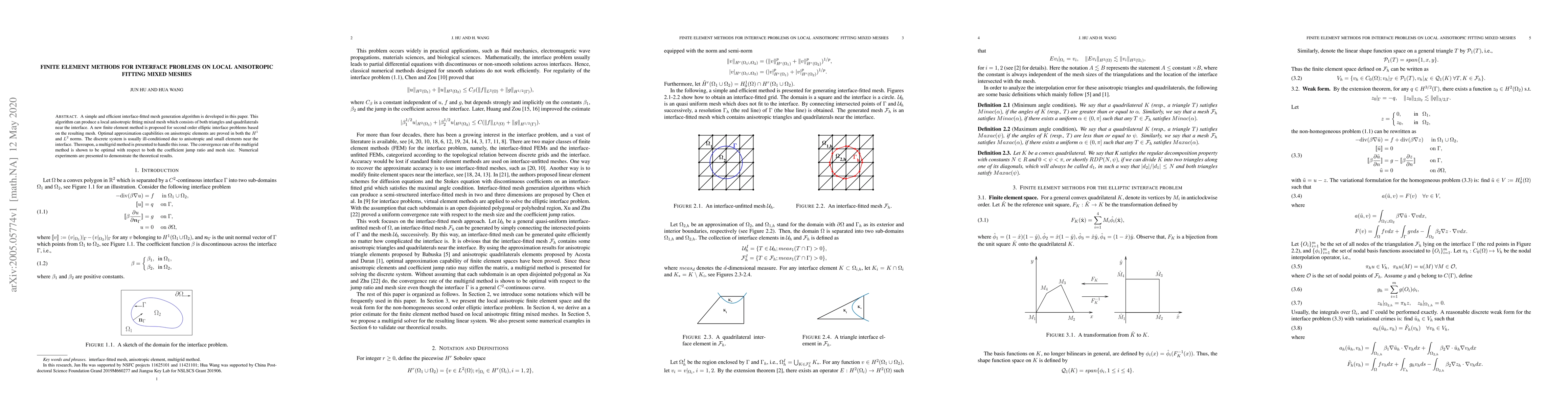 This paper develops an efficient mesh generation algorithm for interface problems that produces local anisotropic mixed meshes of triangles and quadrilaterals. It proposes a new finite element method for second-order elliptic interface problems, proving optimal approximation capabilities and presenting a multigrid method to address ill-conditioning due to anisotropy and small elements, with demonstrated optimal convergence rates and numerical experiments validating the theoretical results.
