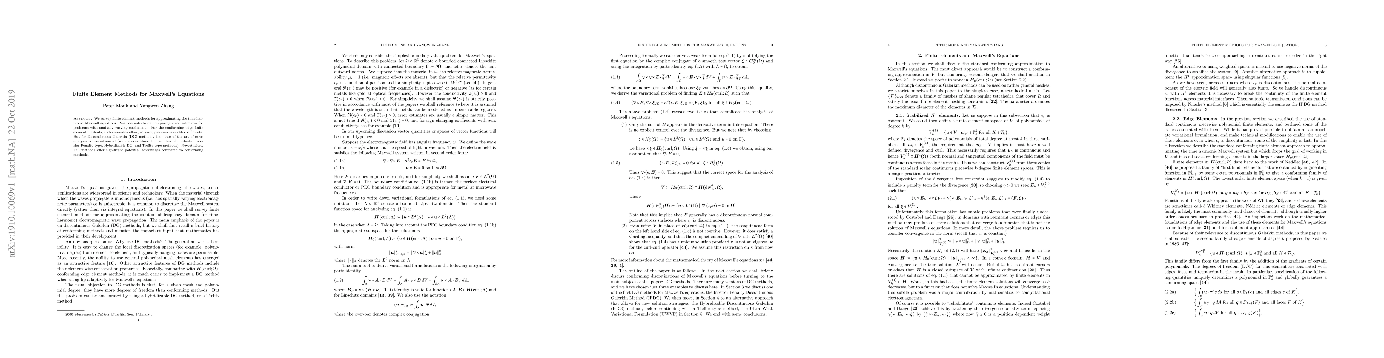 The paper surveys finite element methods for approximating time-harmonic Maxwell's equations, focusing on error estimates for problems with spatially varying coefficients. It compares conforming edge finite element methods with discontinuous Galerkin (DG) methods, including Interior Penalty, Hybridizable DG, and Trefftz type methods.