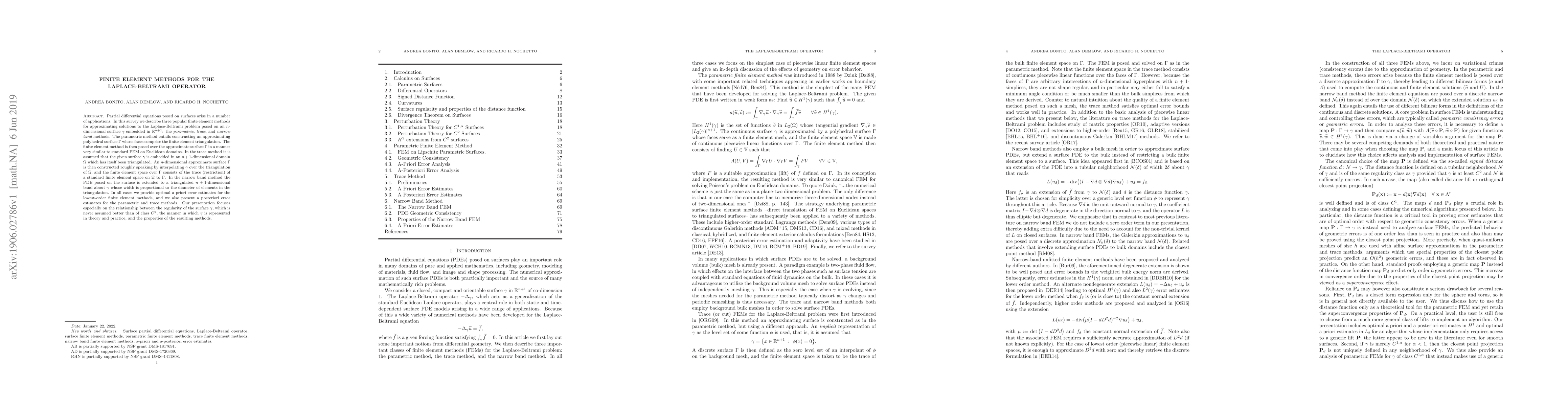 This paper surveys three finite element methods for solving the Laplace-Beltrami operator on surfaces: parametric, trace, and narrow band methods. It provides optimal a priori and a posteriori error estimates, focusing on the surface's regularity and representation in relation to the methods' properties.