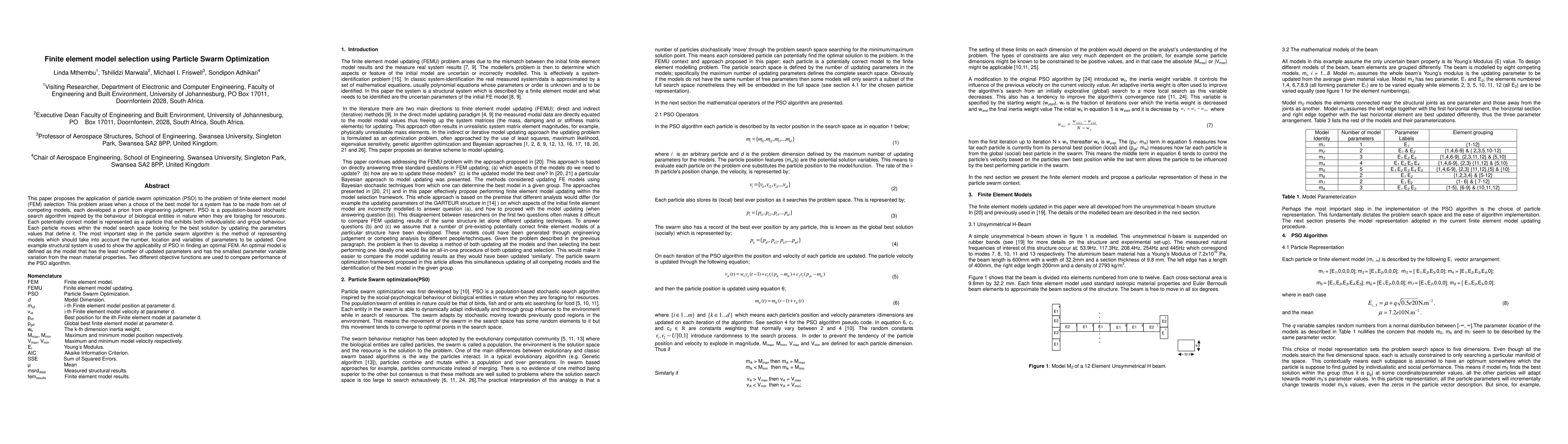 This paper proposes using particle swarm optimization (PSO) to select the best finite element model (FEM) from a set of competing models. PSO is applied to find an optimal FEM with minimal parameter updates and variation, demonstrating its effectiveness through a structural system example.