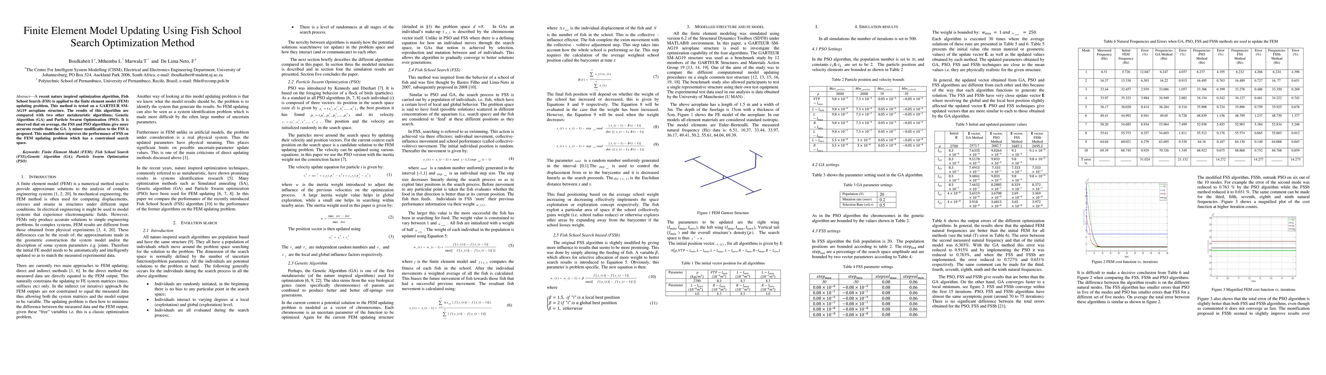 A recent nature inspired optimization algorithm, Fish School Search (FSS) is applied to the finite element model (FEM) updating problem. This method is tested on a GARTEUR SM-AG19 aeroplane structure. The results of this algorithm are compared with two other metaheuristic algorithms; Genetic Algorithm (GA) and Particle Swarm Optimization (PSO). It is observed that on average, the FSS and PSO algorithms give more accurate results than the GA. A minor modification to the FSS is proposed. This modification improves the performance of FSS on the FEM updating problem which has a constrained search space.