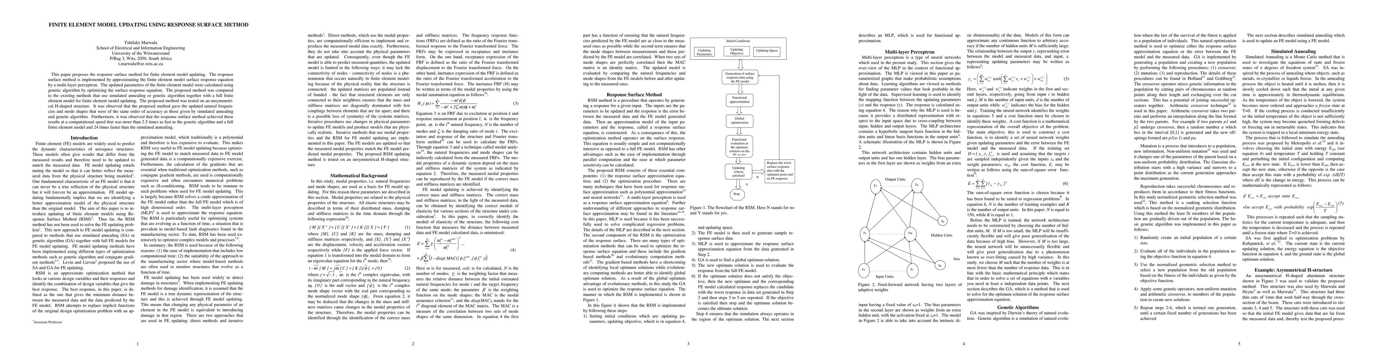 This paper proposes the response surface method for finite element model updating. The response surface method is implemented by approximating the finite element model surface response equation by a multi-layer perceptron. The updated parameters of the finite element model were calculated using genetic algorithm by optimizing the surface response equation. The proposed method was compared to the existing methods that use simulated annealing or genetic algorithm together with a full finite element model for finite element model updating. The proposed method was tested on an unsymmetri-cal H-shaped structure. It was observed that the proposed method gave the updated natural frequen-cies and mode shapes that were of the same order of accuracy as those given by simulated annealing and genetic algorithm. Furthermore, it was observed that the response surface method achieved these results at a computational speed that was more than 2.5 times as fast as the genetic algorithm and a full finite element model and 24 times faster than the simulated annealing.