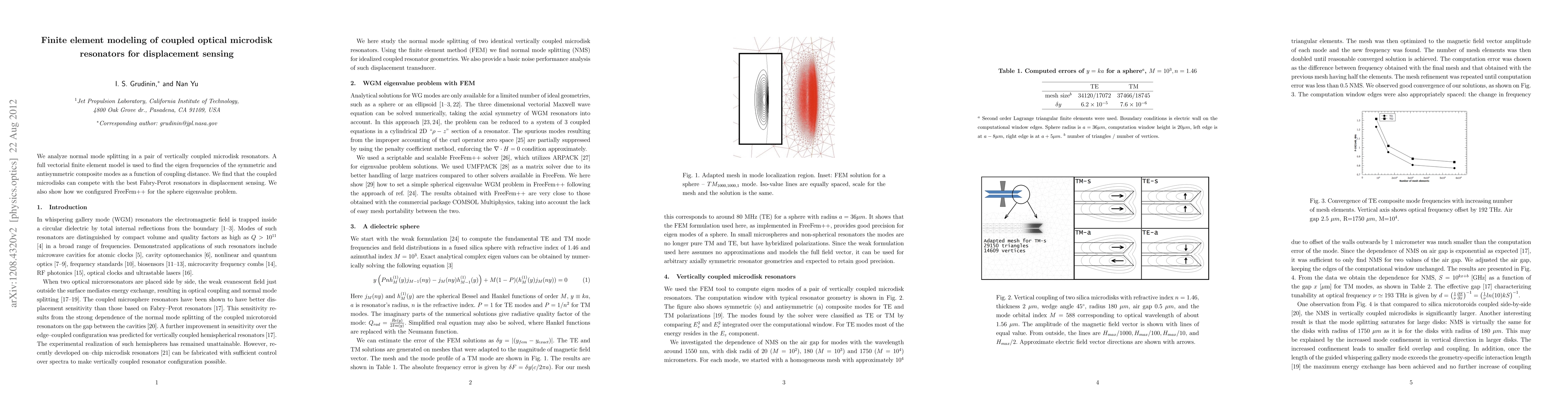 The paper presents a detailed finite element modeling of vertically coupled microdisk resonators using FreeFem++, providing a method for analyzing normal mode splitting and displacement sensing capabilities.