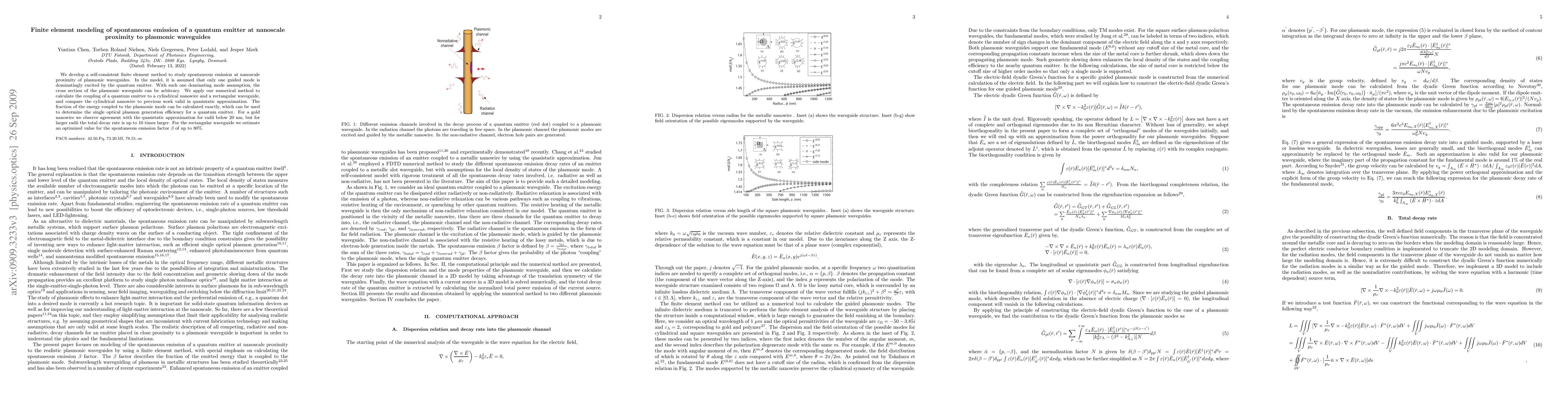 We develop a self-consistent finite element method to study spontaneous emission at nanoscale proximity of plasmonic waveguides. In the model, it is assumed that only one guided mode is dominatingly excited by the quantum emitter. With such one dominating mode assumption, the cross section of the plasmonic waveguide can be arbitrary. We apply our numerical method to calculate the coupling of a quantum emitter to a cylindrical nanowire and a rectangular waveguide, and compare the cylindrical nanowire to previous work valid in quasistatic approximation. The fraction of the energy coupled to the plasmonic mode can be calculated exactly, which can be used to determine the single optical plasmon generation efficiency for a quantum emitter. For a gold nanowire we observe agreement with the quasistatic approximation for radii below 20 nm, but for larger radii the total decay rate is up to 10 times larger. For the rectangular waveguide we estimate an optimized value for the spontaneous emission factor \beta of up to 80%.