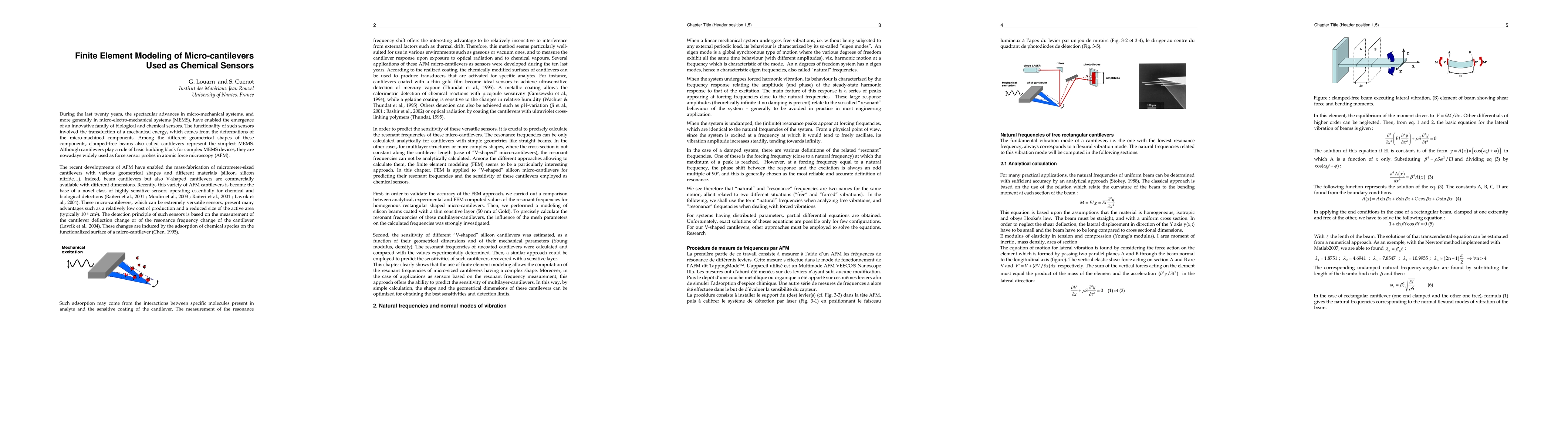 Nowadays, silicon micro-cantilevers with different geometrical shapes are widely used as micro-electro-mechanical systems and, more recently, as force sensor probes in atomic force microscopy (AFM). During the last ten years, several applications, which include these AFM micrometer-sized cantilevers as mass probes in microbalances or as chemical sensors in chemical micro-system devices, were developed. In the case of complex shapes of cantilevers, where the cross-section is not constant along the cantilever length (case of ?V-shaped? micro-cantilevers), their resonant frequencies can not be analytically calculated. Firstly, in order to validate the accuracy of our FEM approach, we carried out a comparison between analytical, experimental and FEM-computed values of the resonant frequencies for homogenous rectangular shaped micro-cantilevers. Then, we performed a modeling of silicon beams coated with a thin sensitive layer (50 nm of Gold). To precisely calculate the resonant frequencies of these multilayer-cantilevers, the influence of the mesh parameters on the calculated frequencies was strongly investigated. Secondly, the sensitivity of different ?V-shaped? silicon cantilevers was estimated, as a function of their geometrical dimensions and of their mechanical parameters (Young modulus, density). The resonant frequencies of uncoated cantilevers were calculated and compared with the values experimentally determined. Then, a similar approach was employed to predict the sensitivities of such cantilevers recovered with a sensitive layer.