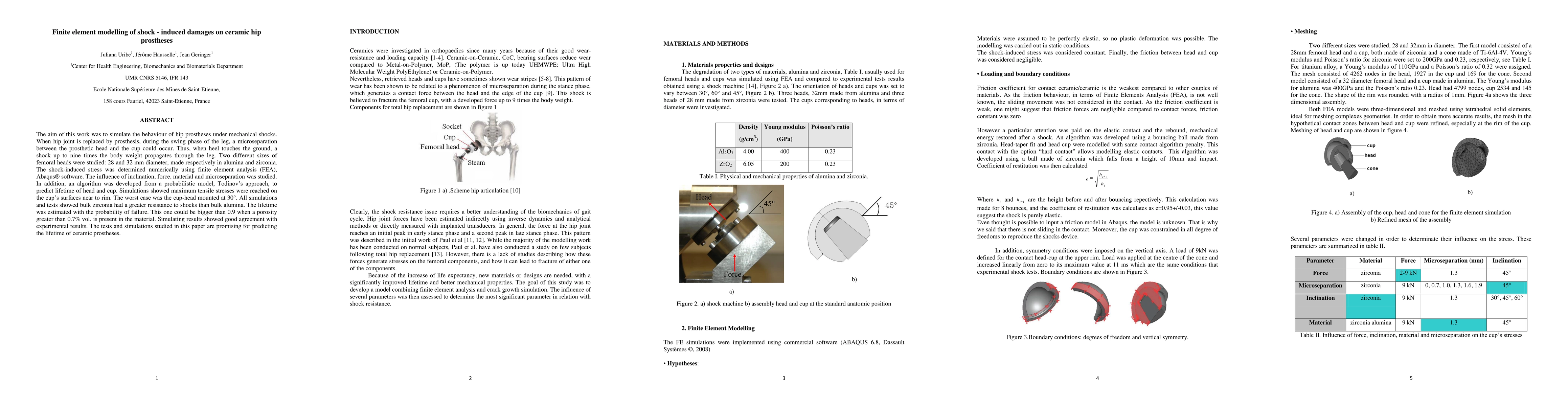 This study uses finite element analysis to simulate shock-induced damages on ceramic hip prostheses, comparing 28 and 32 mm femoral heads made of alumina and zirconia. Results indicate zirconia has greater shock resistance, with maximum stresses occurring near the cup's rim, especially at 30° inclination.