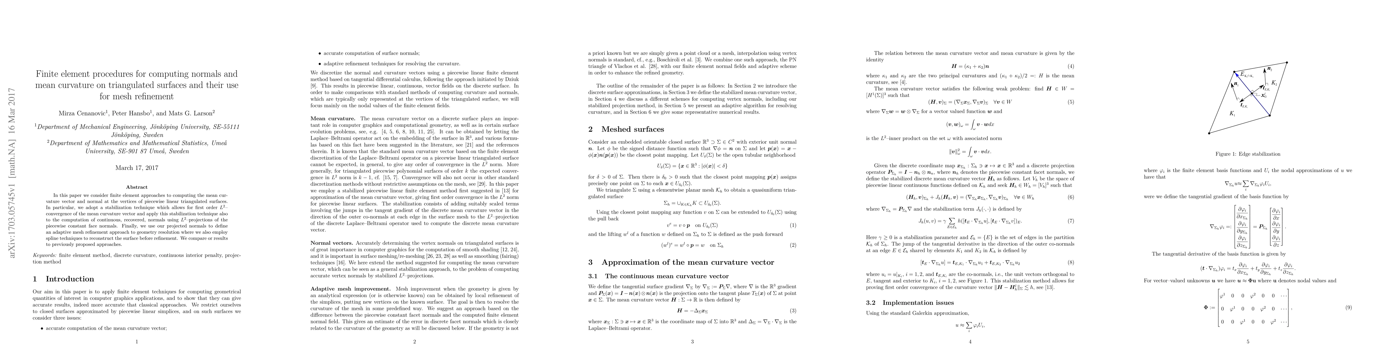 This paper presents finite element methods for computing mean curvature and normals on triangulated surfaces, employing stabilization techniques for $L^2$-convergence. It uses these normals for adaptive mesh refinement and spline reconstruction, comparing results to existing methods.