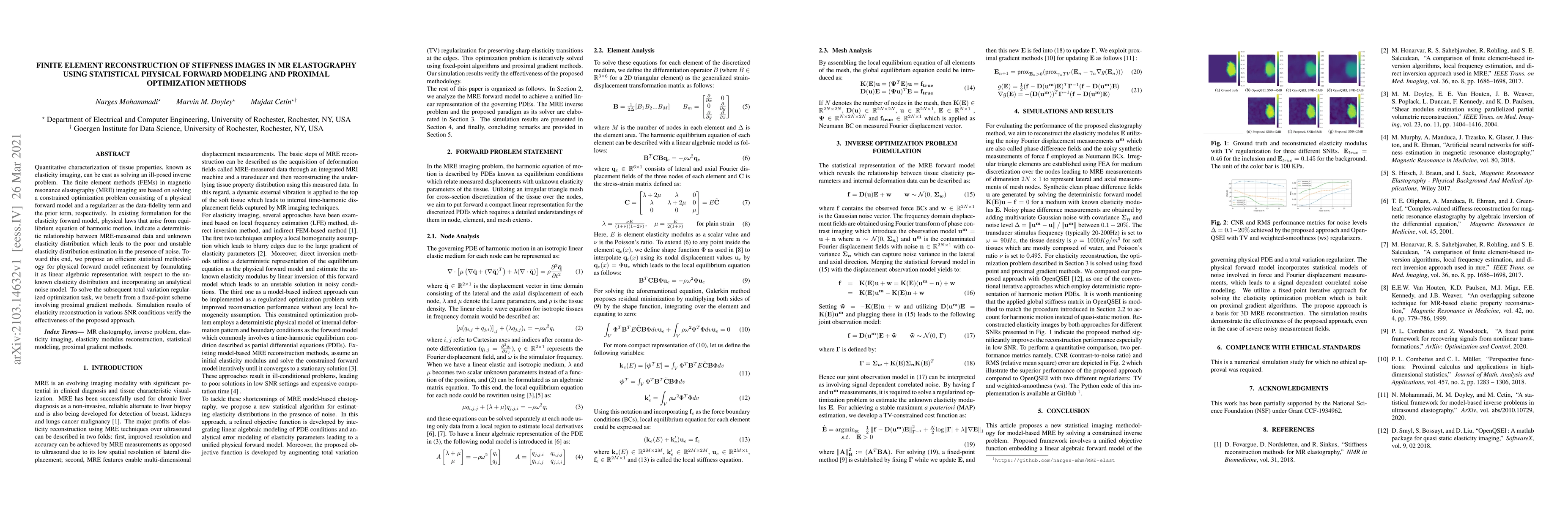 This paper proposes a statistical methodology for refining the physical forward model in MR elastography using linear algebraic representation and an analytical noise model. It employs proximal optimization methods to solve a regularized optimization problem, demonstrating effective elasticity reconstruction in simulations across various signal-to-noise ratios.