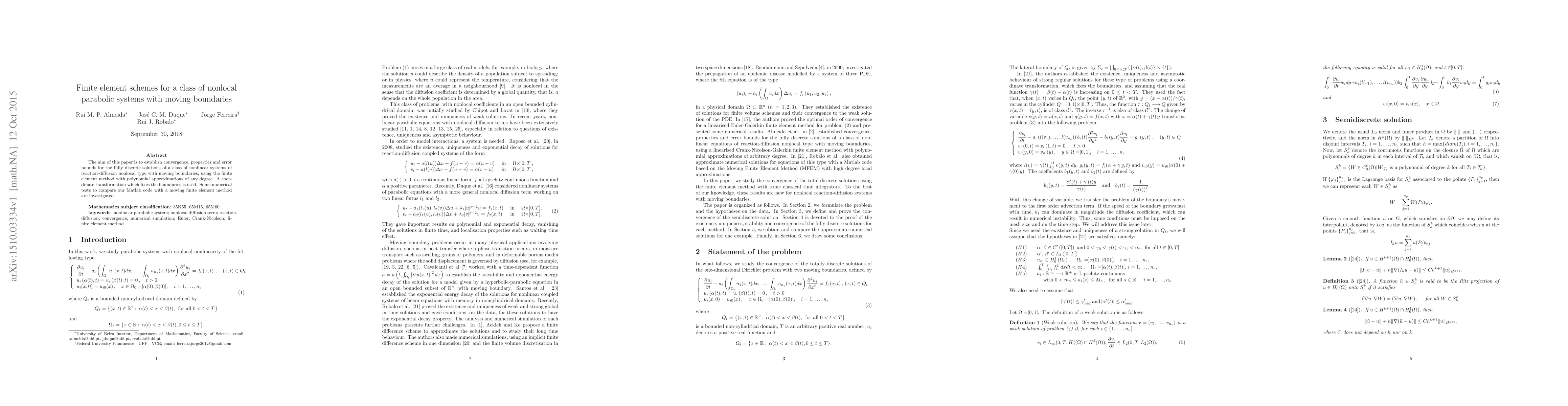 The aim of this paper is to establish convergence, properties and error bounds for the fully discrete solutions of a class of nonlinear systems of reaction-diffusion nonlocal type with moving boundaries, using the finite element method with polynomial approximations of any degree. A coordinate transformation which fixes the boundaries is used. Some numerical tests to compare our Matlab code with a moving finite element method are investigated.