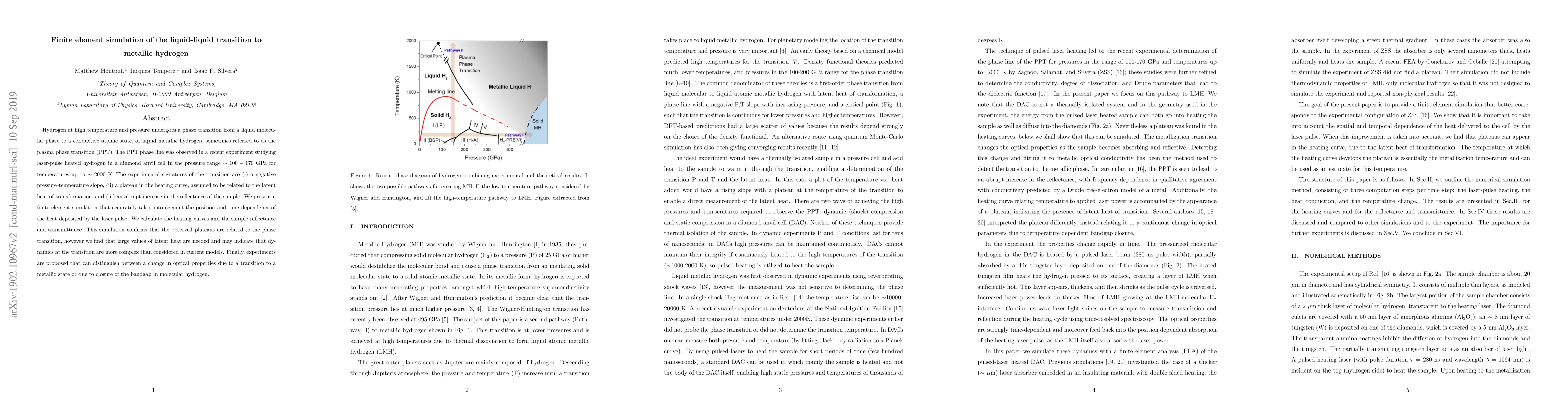 This paper presents a finite element simulation of the plasma phase transition (PPT) in hydrogen, confirming the observed plateaus in heating curves relate to the phase transition. The simulation suggests complex dynamics may be at play, requiring large latent heat values, and proposes experiments to differentiate between metallic state and bandgap closure effects.