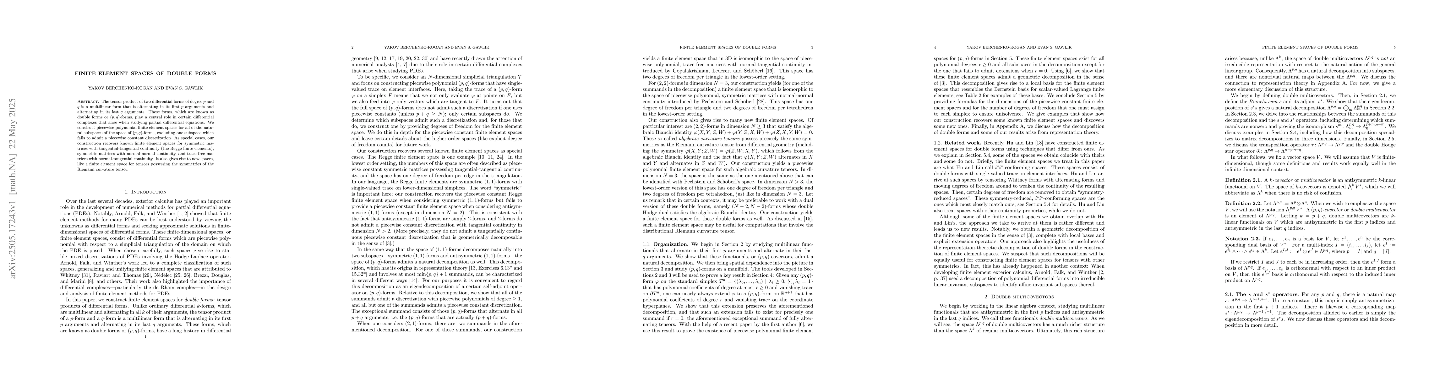 The development of finite element spaces for natural subspaces of $(p,q)$-forms, including new spaces for tensors with Riemann curvature symmetries.