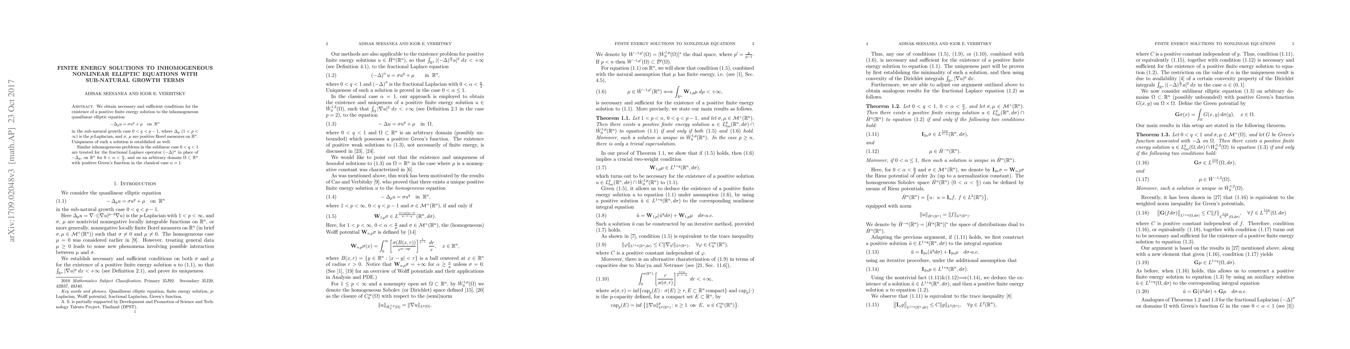 This paper provides necessary and sufficient conditions for the existence of positive finite energy solutions to inhomogeneous quasilinear elliptic equations with sub-natural growth terms, establishing uniqueness. It also addresses similar problems for the fractional Laplace operator in both sublinear and classical cases.