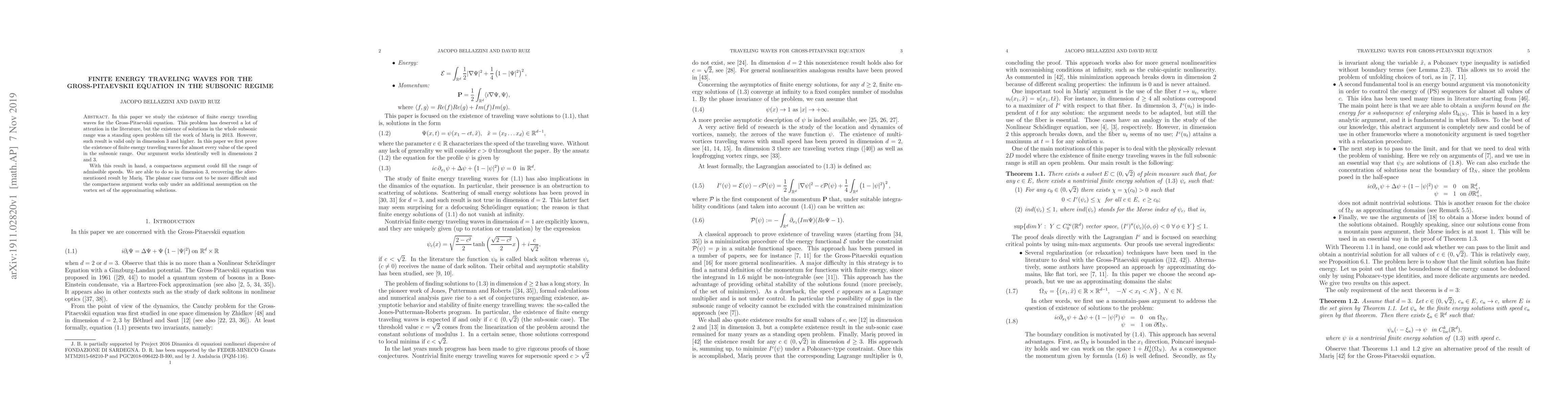 This paper proves the existence of finite energy traveling waves for the Gross-Pitaevskii equation in the subsonic regime across dimensions 2 and 3, filling a gap in the literature. The authors achieve this by extending Maris's 2013 result, which was previously limited to dimensions 3 and higher.