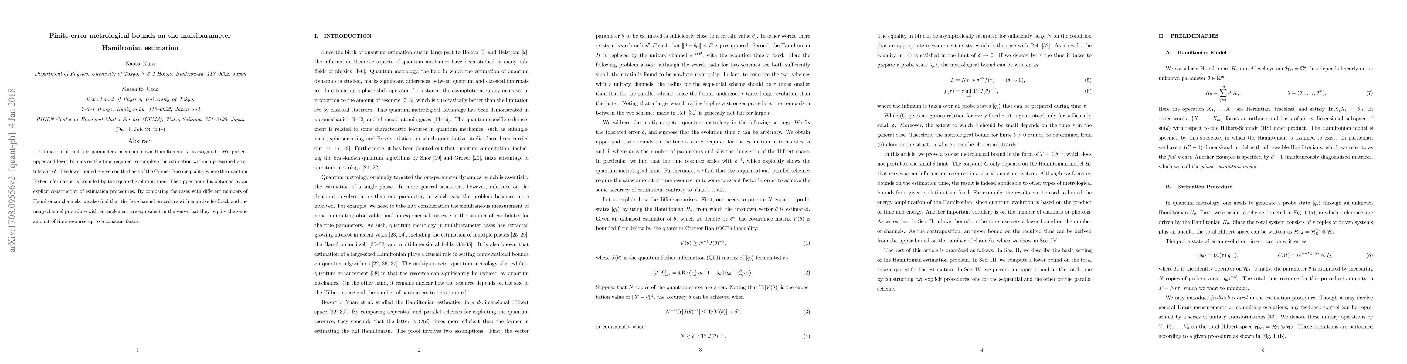Researchers establish bounds on time required to estimate multiple parameters in an unknown Hamiltonian with prescribed tolerance, using Cramr-Rao inequality and explicit construction methods.