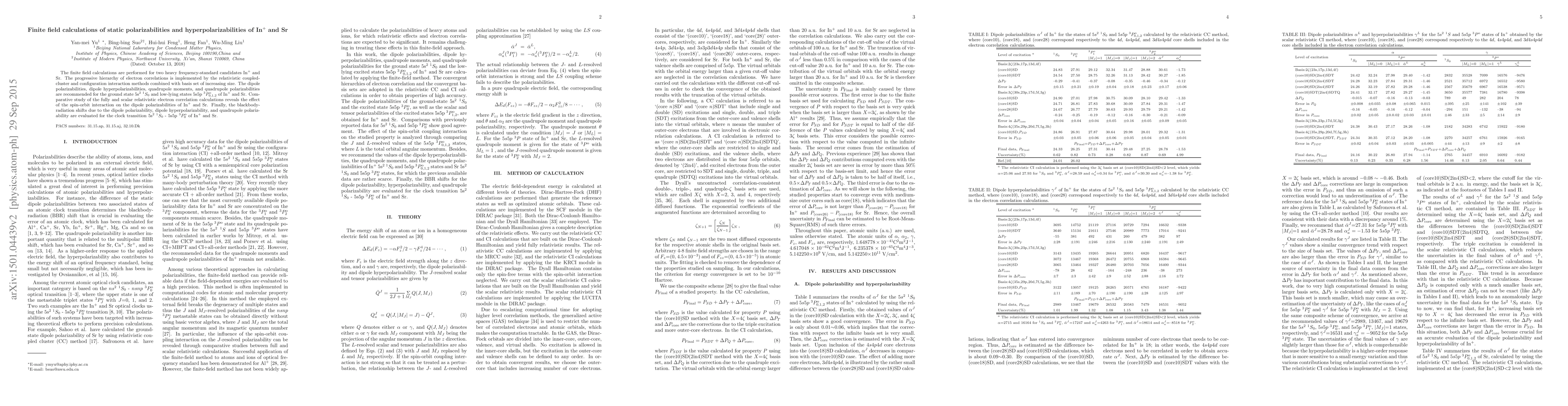 The finite field calculations are performed for two heavy frequency-standard candidates In$^+$ and Sr. The progressive hierarchy of electron correlations is implemented by the relativistic coupled-cluster and configuration interaction methods combined with basis set of increasing size. The dipole polarizabilities, dipole hyperpolarizabilities, quadrupole moments, and quadrupole polarizabilities are recommended for the ground state 5s$^2$ $^1S_0$ and low-lying states 5s5p $^3P^{\rm o}_{0,1,2}$ of In$^+$ and Sr. Comparative study of the fully and scalar relativistic electron correlation calculations reveals the effect of the spin-orbit interaction on the dipole polarizabilities of In$^{+}$ and Sr. Finally, the blackbody-radiation shifts due to the dipole polarizability, dipole hyperpolarizability, and quadrupole polarizability are evaluated for the clock transition 5s$^2$ $^1S_0$ - 5s5p $^3P^{\rm o}_0$ of In$^+$ and Sr.