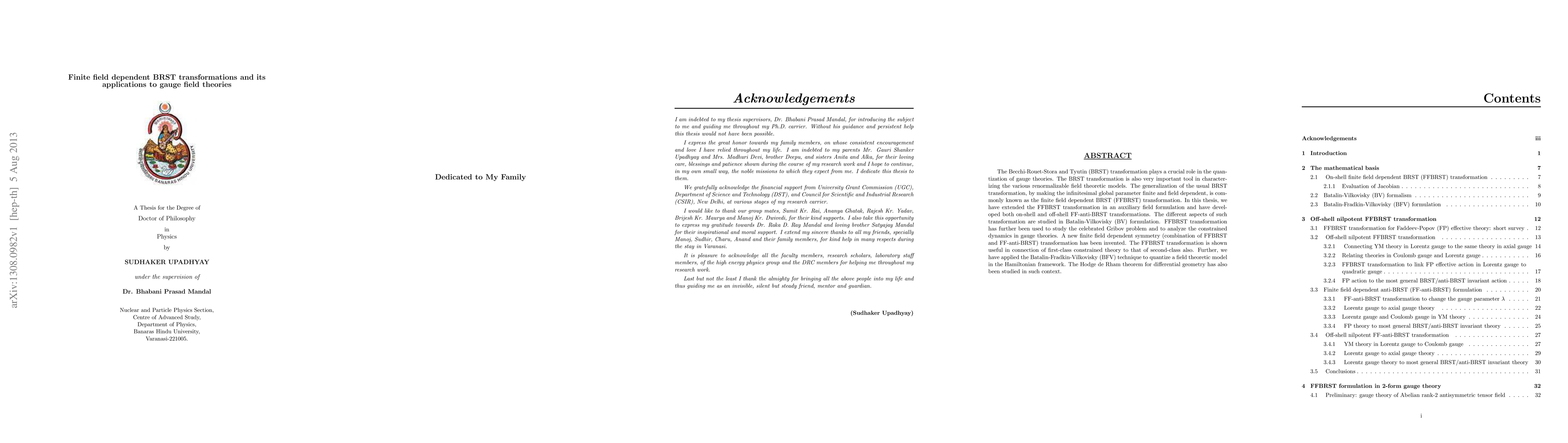 The Becchi-Rouet-Stora and Tyutin (BRST) transformation plays a crucial role in the quantization of gauge theories. The BRST transformation is also very important tool in characterizing the various renormalizable field theoretic models. The generalization of the usual BRST transformation, by making the infinitesimal global parameter finite and field dependent, is commonly known as the finite field dependent BRST (FFBRST) transformation. In this thesis, we have extended the FFBRST transformation in an auxiliary field formulation and have developed both on-shell and off-shell FF-anti-BRST transformations. The different aspects of such transformation are studied in Batalin-Vilkovisky (BV) formulation. FFBRST transformation has further been used to study the celebrated Gribov problem and to analyze the constrained dynamics in gauge theories. A new finite field dependent symmetry (combination of FFBRST and FF-anti-BRST) transformation has been invented. The FFBRST transformation is shown useful in connection of first-class constrained theory to that of second-class also. Further, we have applied the Batalin-Fradkin-Vilkovisky (BFV) technique to quantize a field theoretic model in the Hamiltonian framework. The Hodge de Rham theorem for differential geometry has also been studied in such context.