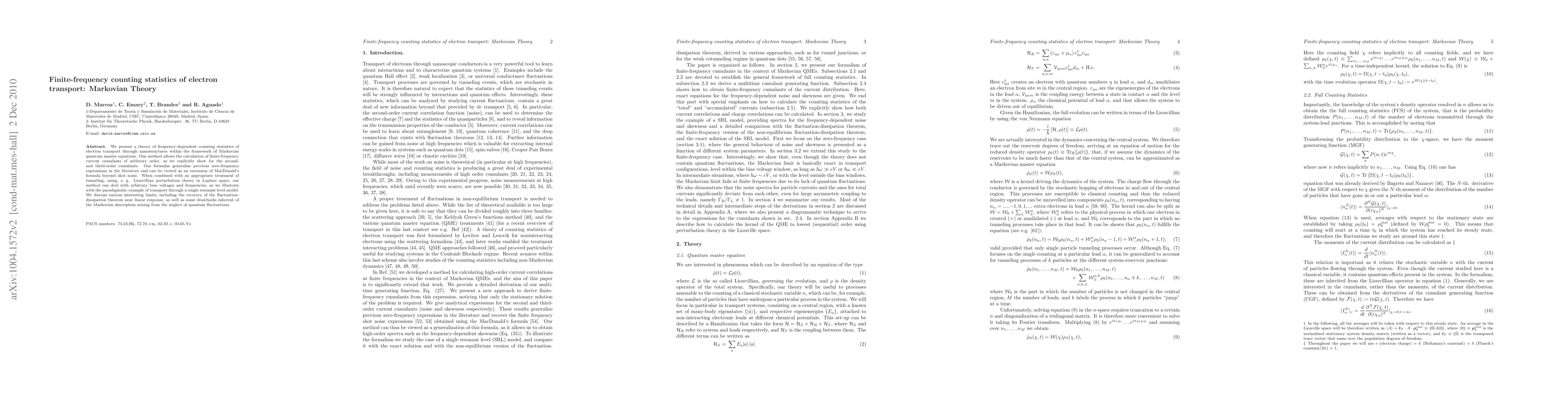 This paper develops a Markovian quantum master equation framework for calculating finite-frequency counting statistics of electron transport in nanostructures, extending MacDonald's formula to higher-order current cumulants. It illustrates the method's applicability to various bias voltages and frequencies using a single resonant level model.
