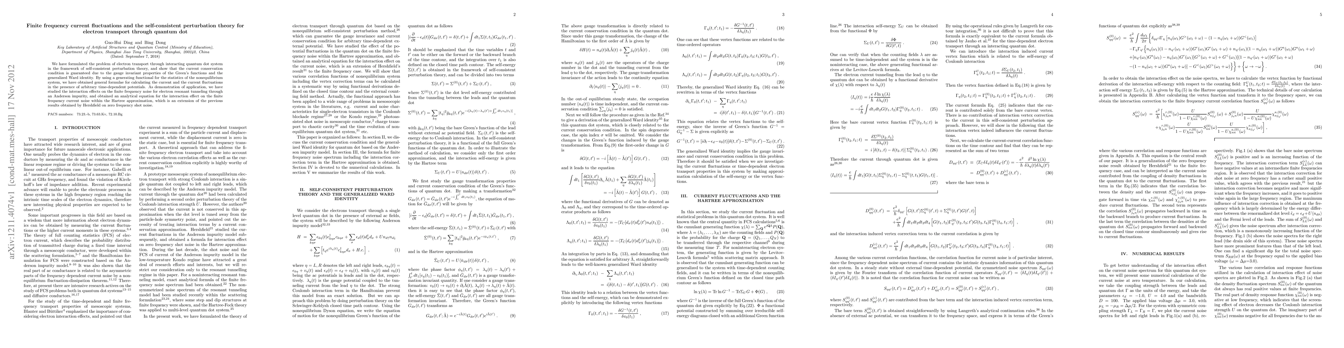 This paper develops a self-consistent perturbation theory for electron transport in quantum dot systems, ensuring current conservation through gauge invariant properties. It provides general formulas for current and current fluctuations under time-dependent potentials, and applies this to analyze interaction effects on the finite frequency noise in electron resonant tunneling through an Anderson impurity.
