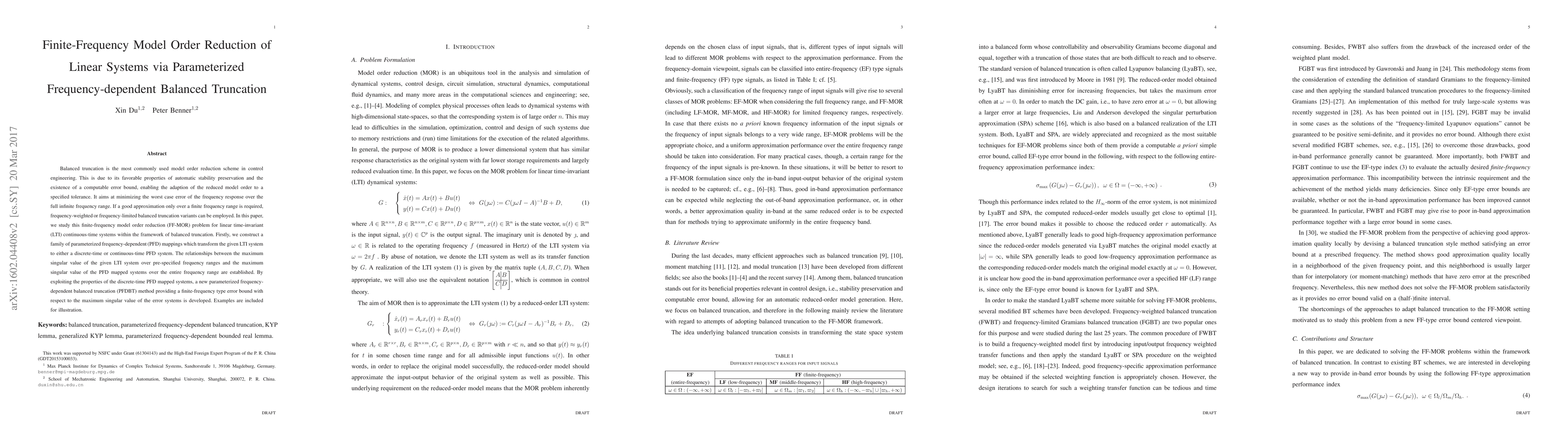 This paper proposes a new parameterized frequency-dependent balanced truncation (PFDBT) method for finite-frequency model order reduction of linear continuous-time systems. It establishes a connection between the maximum singular value of the original system and the PFD mapped systems, providing a finite-frequency error bound.