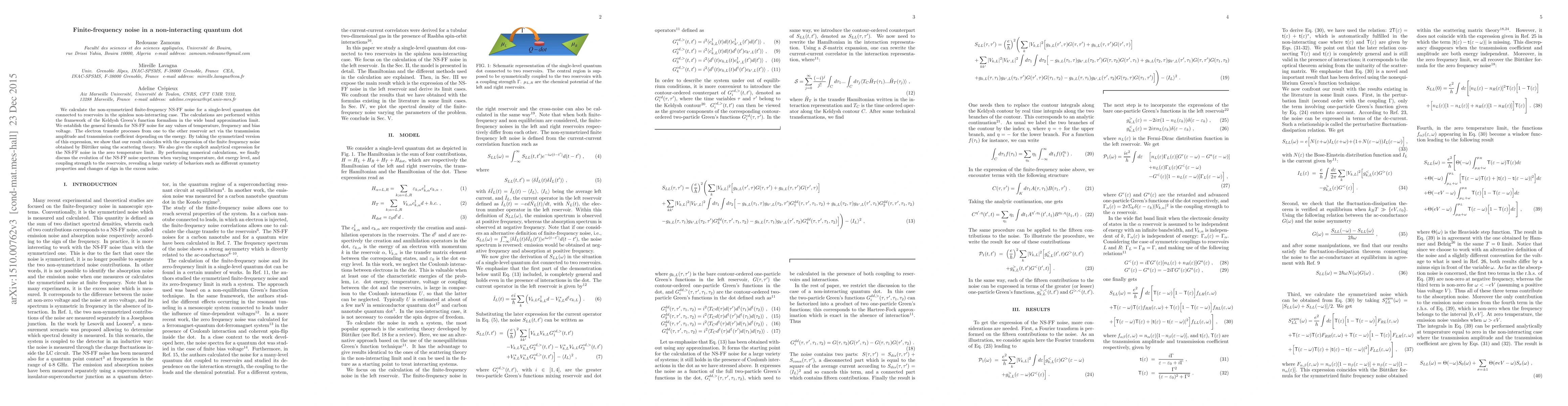 This paper calculates the non-symmetrized finite-frequency noise in a non-interacting quantum dot using the Keldysh Green's function formalism, establishing a general formula for any temperature, frequency, and bias voltage. It also discusses the evolution of the noise spectrum under varying conditions and confirms the result aligns with B\"uttiker's scattering theory approach.
