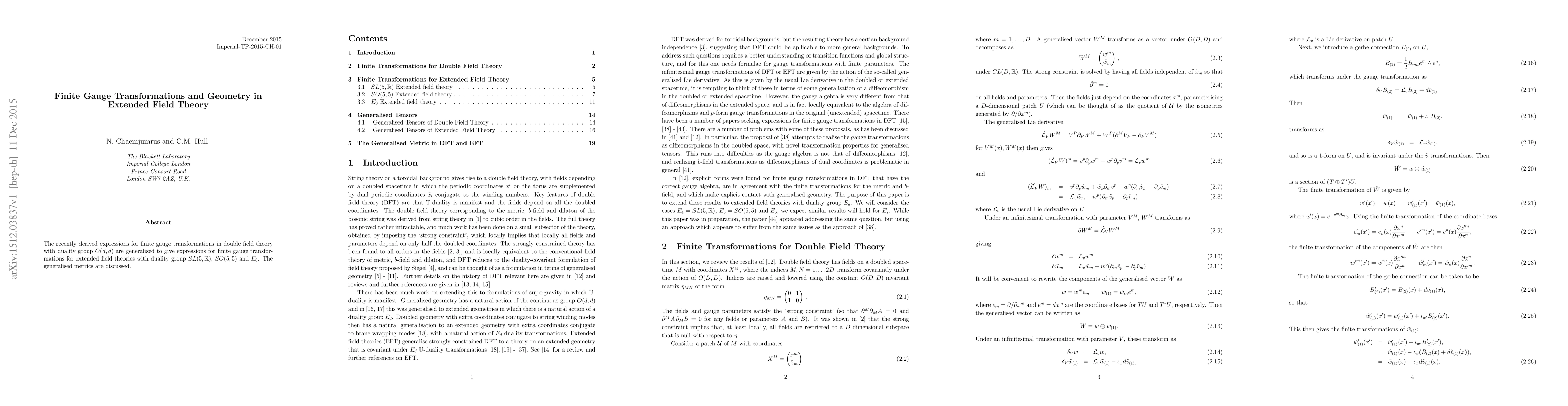 This paper generalises expressions for finite gauge transformations in extended field theories beyond double field theory, focusing on duality groups SL(5,R), SO(5,5), and E6, and discusses the implications for generalised metrics.