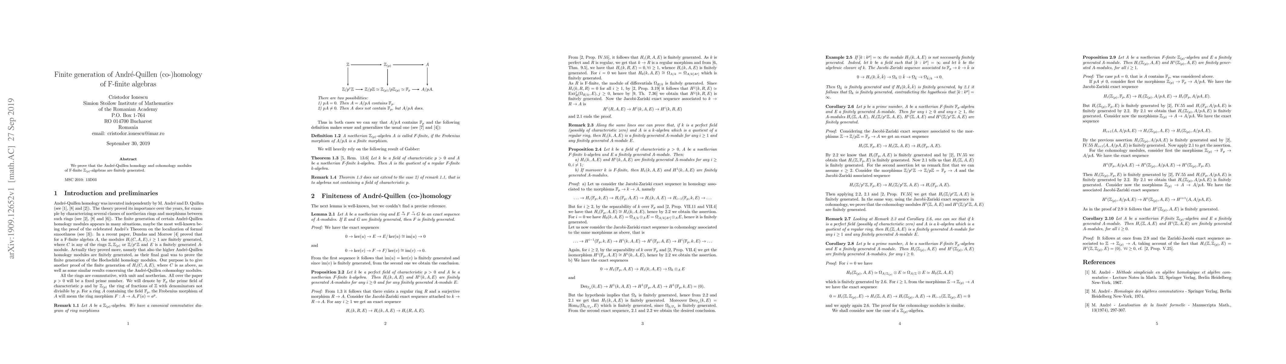 Summary: The paper establishes that the Andre-Quillen (co-)homology modules of F-finite Z(p)-algebras are finitely generated, extending the understanding of their homological properties.