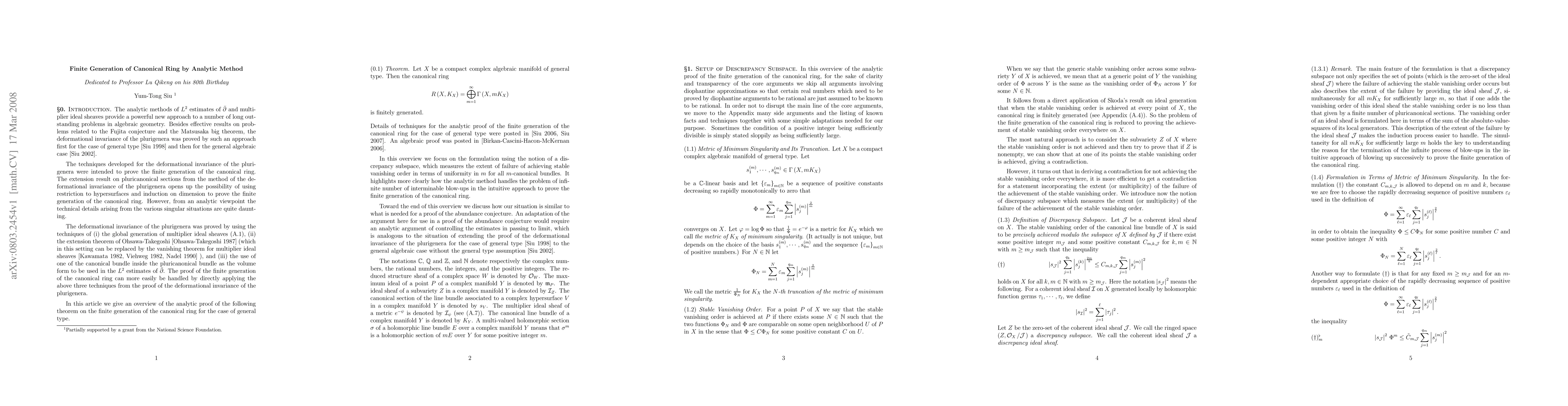 This paper discusses an analytic method for proving the finite generation of the canonical ring for compact complex algebraic manifolds of general type, addressing the challenge of infinite blow-ups in traditional approaches. The author provides an overview of the analytic proof and its effectiveness in handling these complexities.