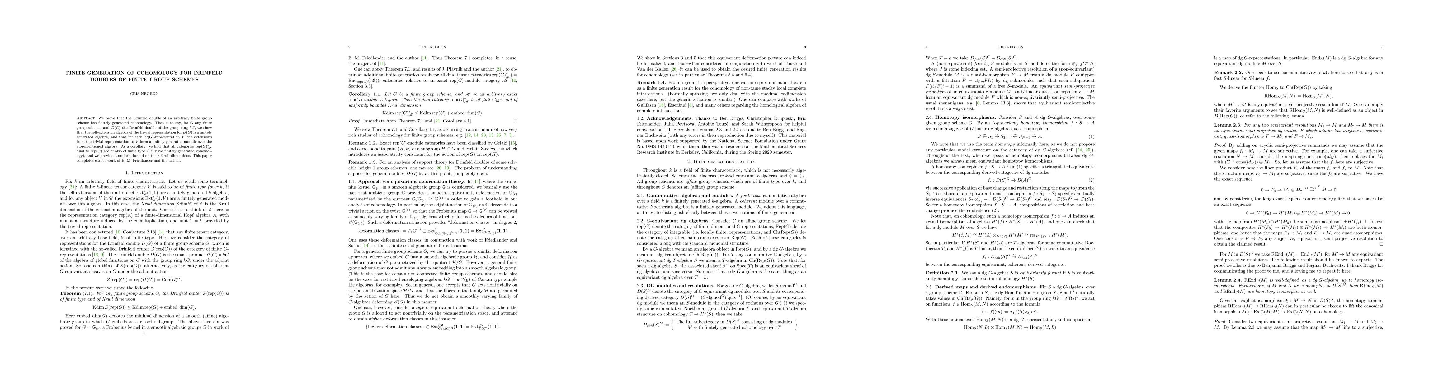 We prove that the Drinfeld double of an arbitrary finite group scheme has finitely generated cohomology. That is to say, for G any finite group scheme, and D(G) the Drinfeld double of the group ring kG, we show that the self-extension algebra of the trivial representation for D(G) is a finitely generated algebra, and that for each D(G)-representation V the extensions from the trivial representation to V form a finitely generated module over the aforementioned algebra. As a corollary, we find that all categories rep(G)*_M dual to rep(G) are of also of finite type (i.e. have finitely generated cohomology), and we provide a uniform bound on their Krull dimensions. This paper completes earlier work of E. M. Friedlander and the author.