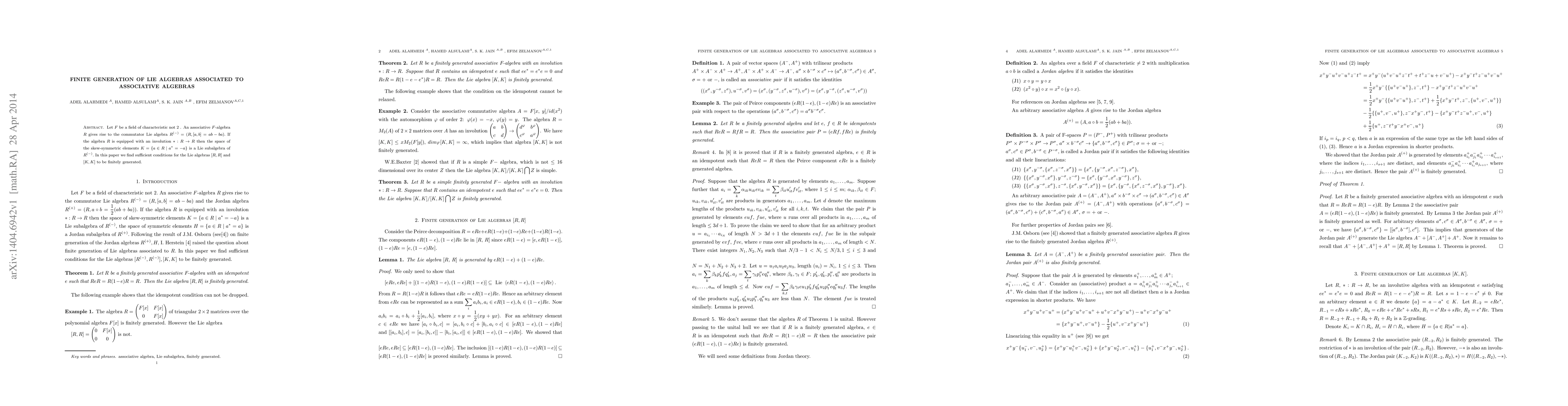 Let $F$ be a field of characteristic not $2$ . An associative $F$-algebra $R$ gives rise to the commutator Lie algebra $R^{(-)}=(R,[a,b]=ab-ba).$ If the algebra $R$ is equipped with an involution $*:R\rightarrow R$ then the space of the skew-symmetric elements $K=\{a \in R \mid a^{*}=-a \}$ is a Lie subalgebra of $R^{(-)}.$ In this paper we find sufficient conditions for the Lie algebras $[R,R]$ and $[K,K]$ to be finitely generated.